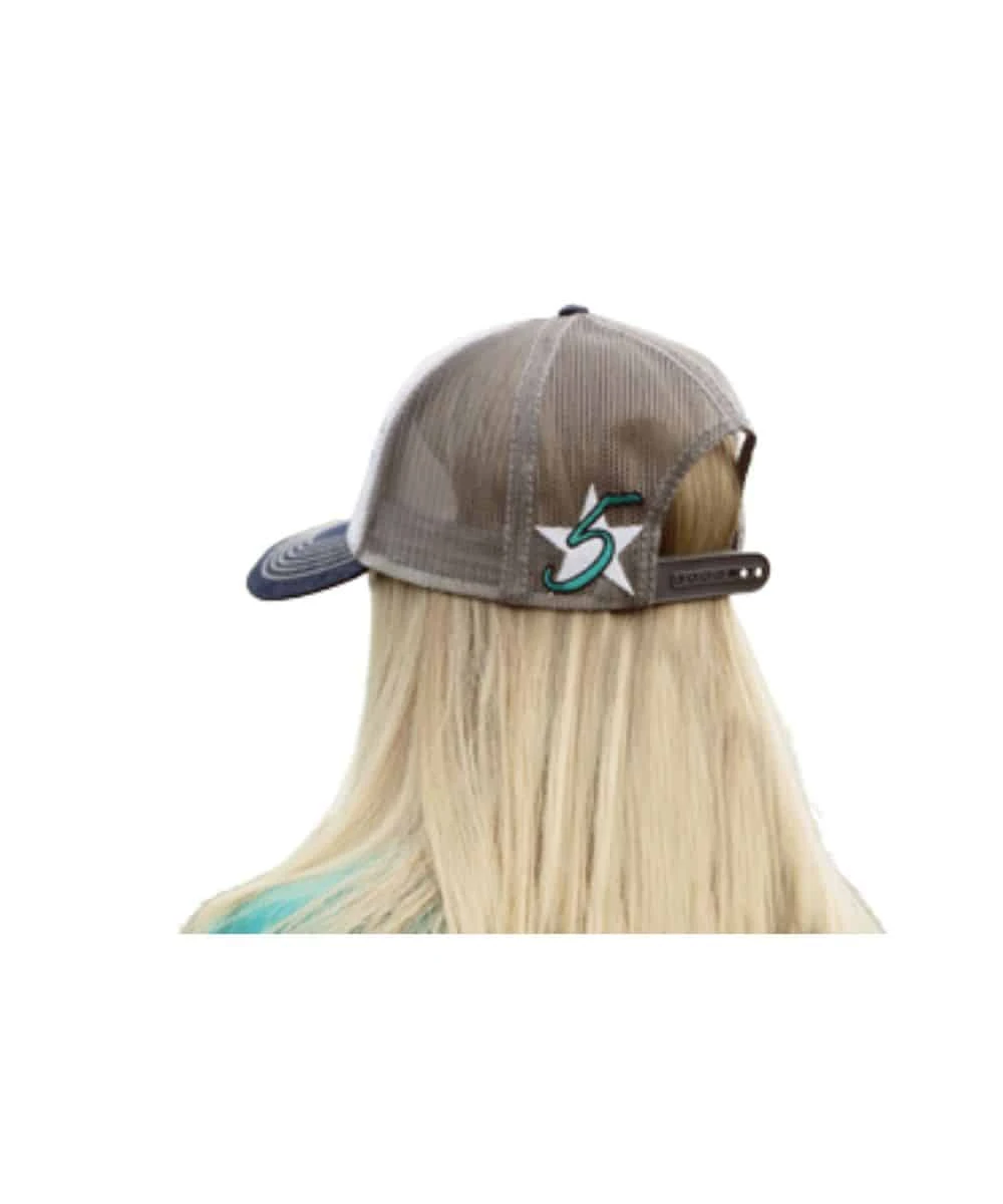 6 Panel Construction; White Front Panels; Denim Brim; Gray Stitching; Gray Mesh Back; Turquoise And White 5 Star Logo On Left Front Panel; White And Turquoise 5 Star Logo On Back Left Panel; Snap Back Closure; Style #OSTRIL5S-DGR