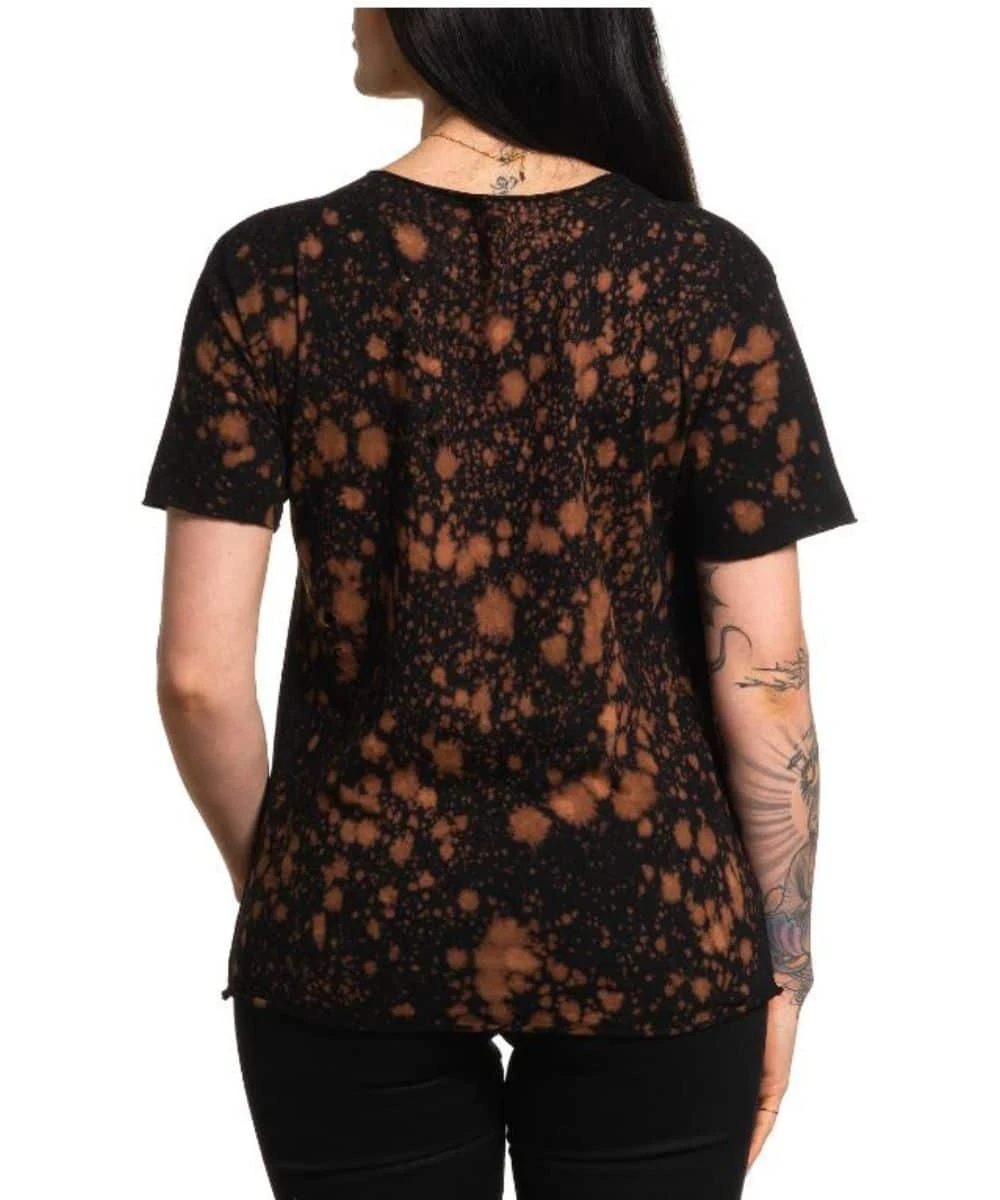100% Cotton; Color: Black Acid Pebble Wash; Scoop Neck; Laser Cuts At Neckline; Rhinestone Accented Graphic; Front Graphic Displays Flying Eagle With Words ‘AFFLICTION WILD AND FREE’; Short Sleeve; Style #AW24626