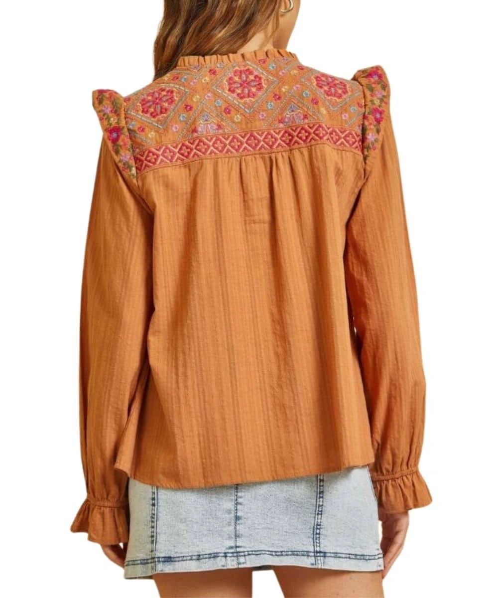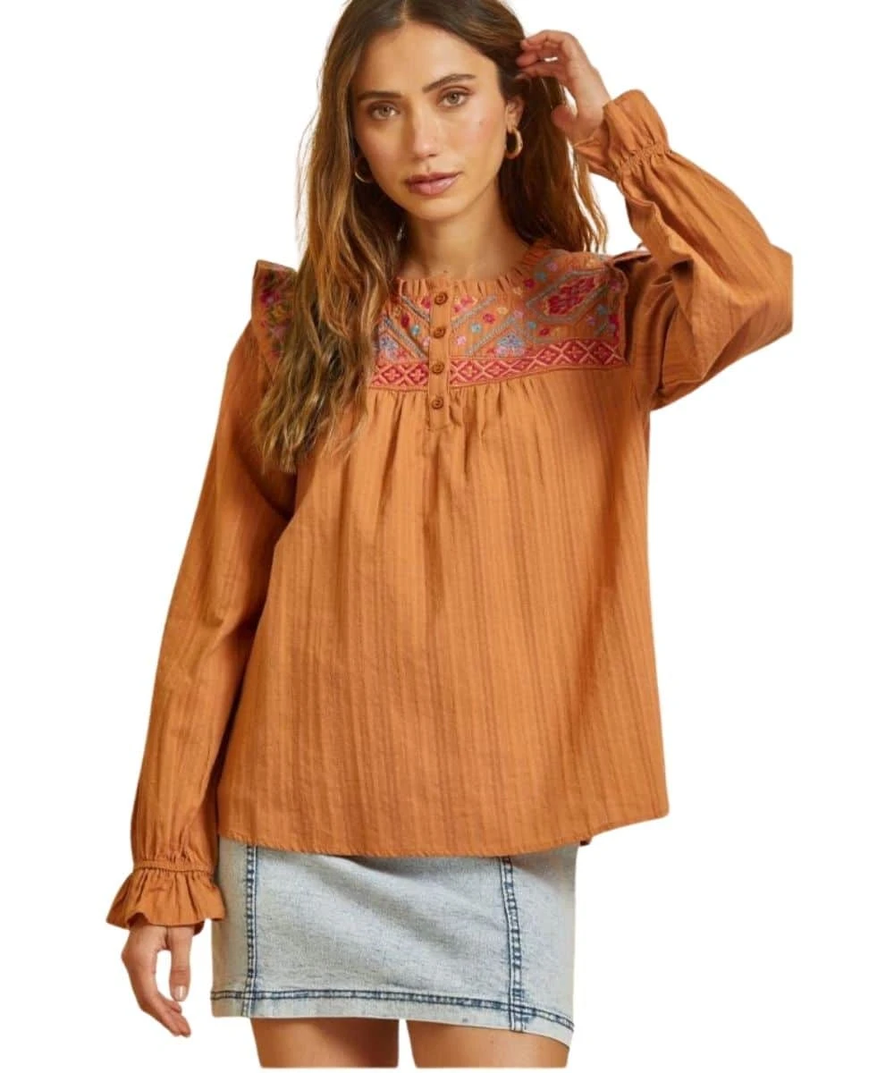 100% Cotton; Color: Rust; 1/4 Length Button Closure; Rust Colored Buttons; Ruffled Neckline; Embroidery Above Straight Yoke On Front And Back; Cap Sleeve Detail; Poet Sleeves; Style #PT10944