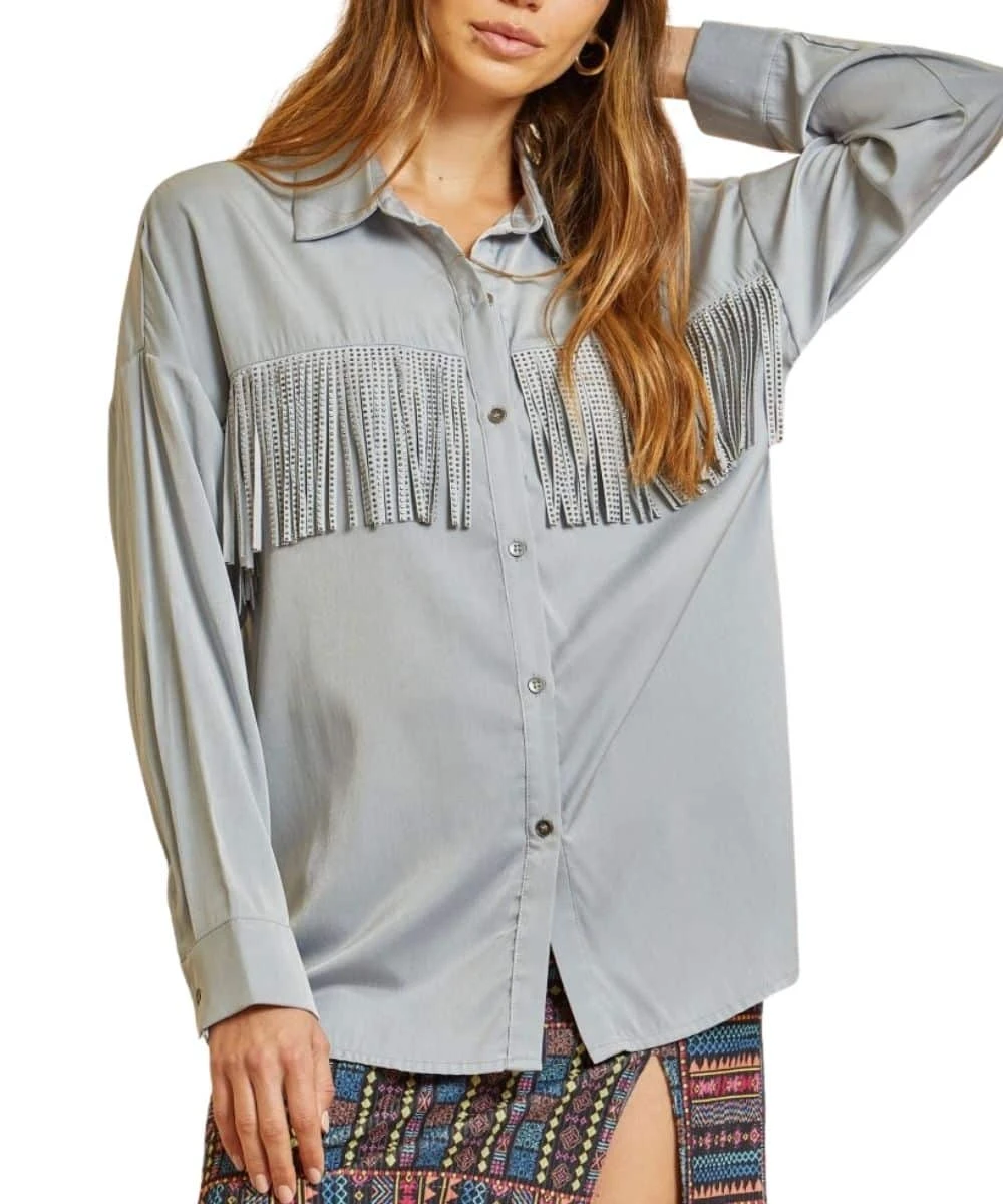 60% Rayon/ 40% Polyester; Spread Collar; Button Down Front; Straight Yoke With Rhinestone Fringe; Cuffed Long Sleeves; Style #T10990