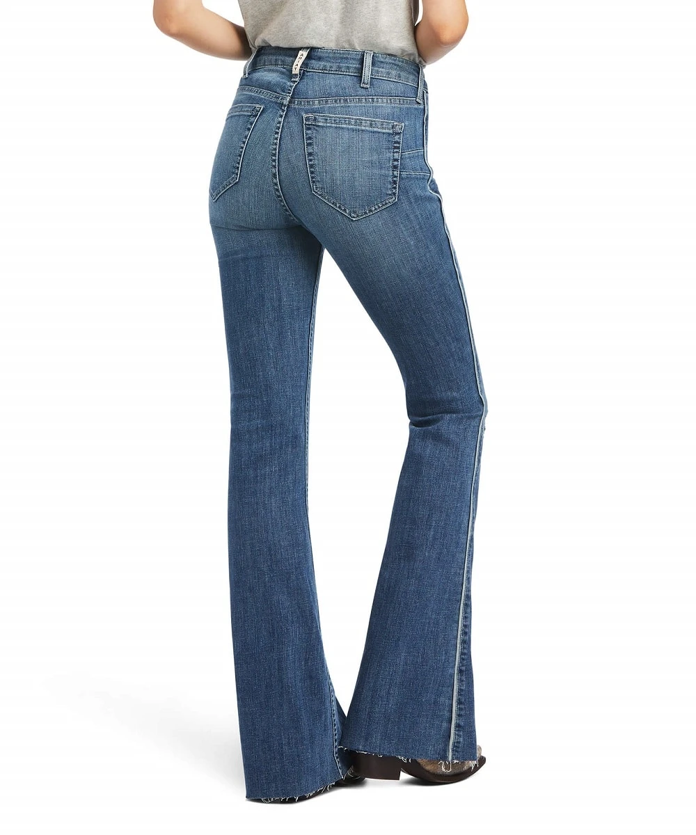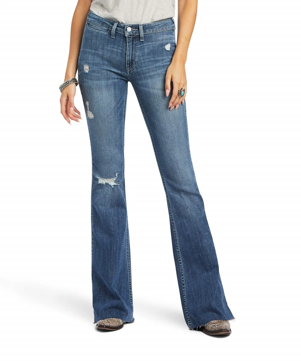 95% Cotton/4% Estrerell-P/1% Lycra Spandex; High Rise; Medium Wash; Whiskers; Fading; Waist Band That Won’t Gap; Seat That Won’t Sag; Retro Slit Pockets; Light Distressing Accents; Raw Edge Flared Leg; Style #10040804