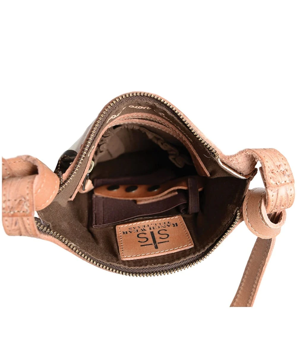Genuine Hair On Hide With Tooled Leather Trim; Zip Closure With STS Pull; Adjustable Cross Body Strap; Exterior Magnetic Slip Pocket; One Interior Zip Pocket; Two Interior Slip Pockets; Concealed Carry Pocket For Small To Medium Size Hand Gun; STS Logo Patch; Measures Approximately: 8″ W X 10 1/2″ H X 1/2″ D; Style #STS38540