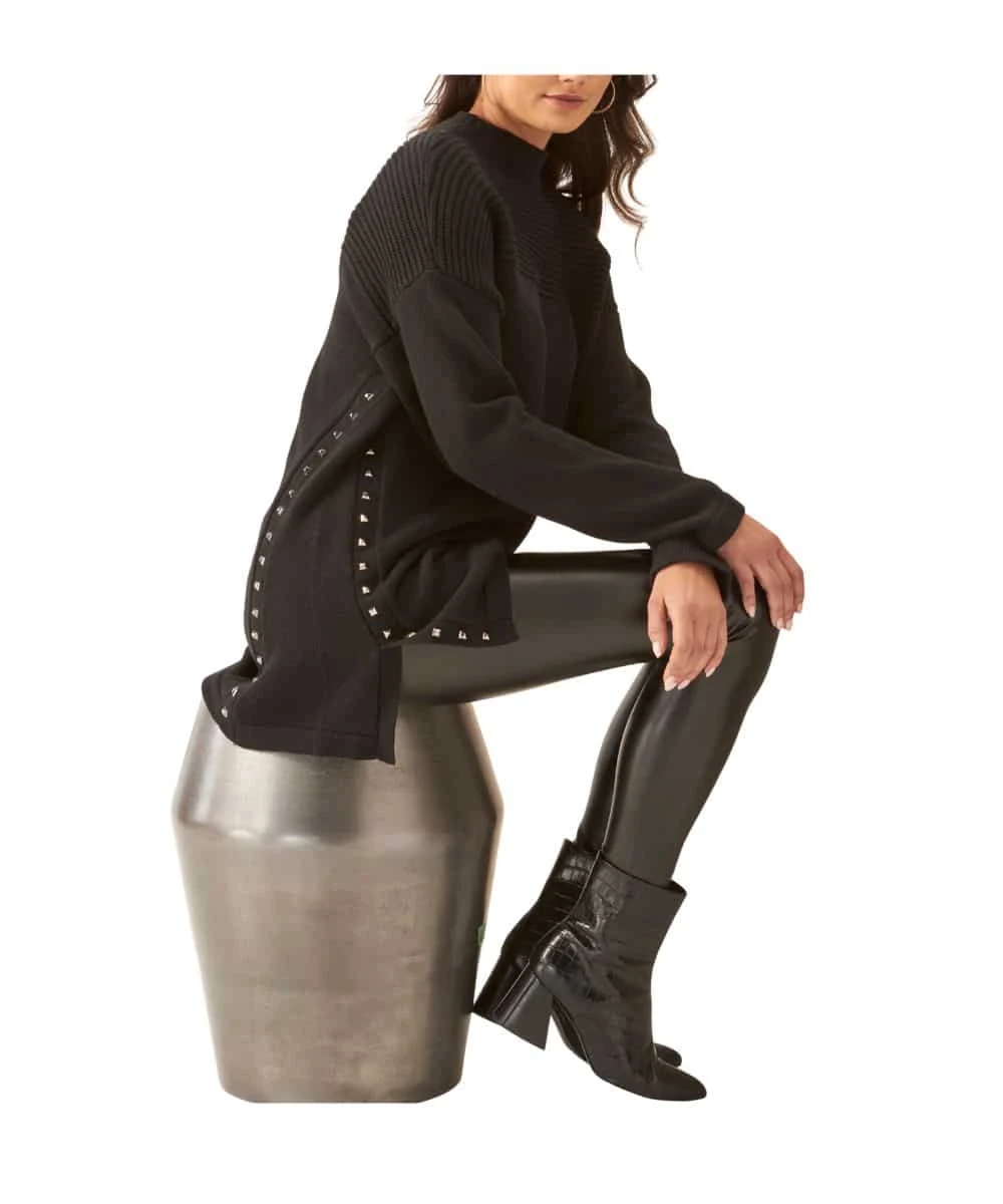 55% Cotton/45% Acrylic; Cotton Rich Tunic Dress; Color: Black; Funnel Neck; Rib Textured Neckline; Gently Dropped Shoulder; Dramatic Side Gore Decorated In Silver Studs And A Side Slit; Easy fit; Machine Wash Gentle; Lay Flat To Dry; Style # 408195