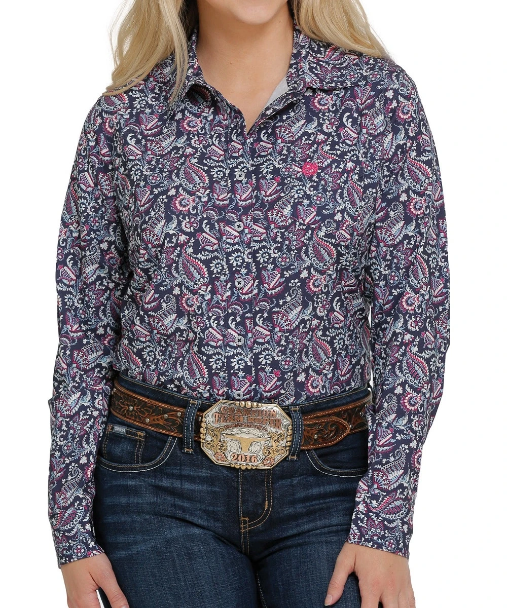 97% Polyester/3% Spandex; Long Sleeve; Spread Collar; Button Cuffs; Single Open Pocket; Color: Navy, Red, White And Blue Floral Print; Style #MSW9163009