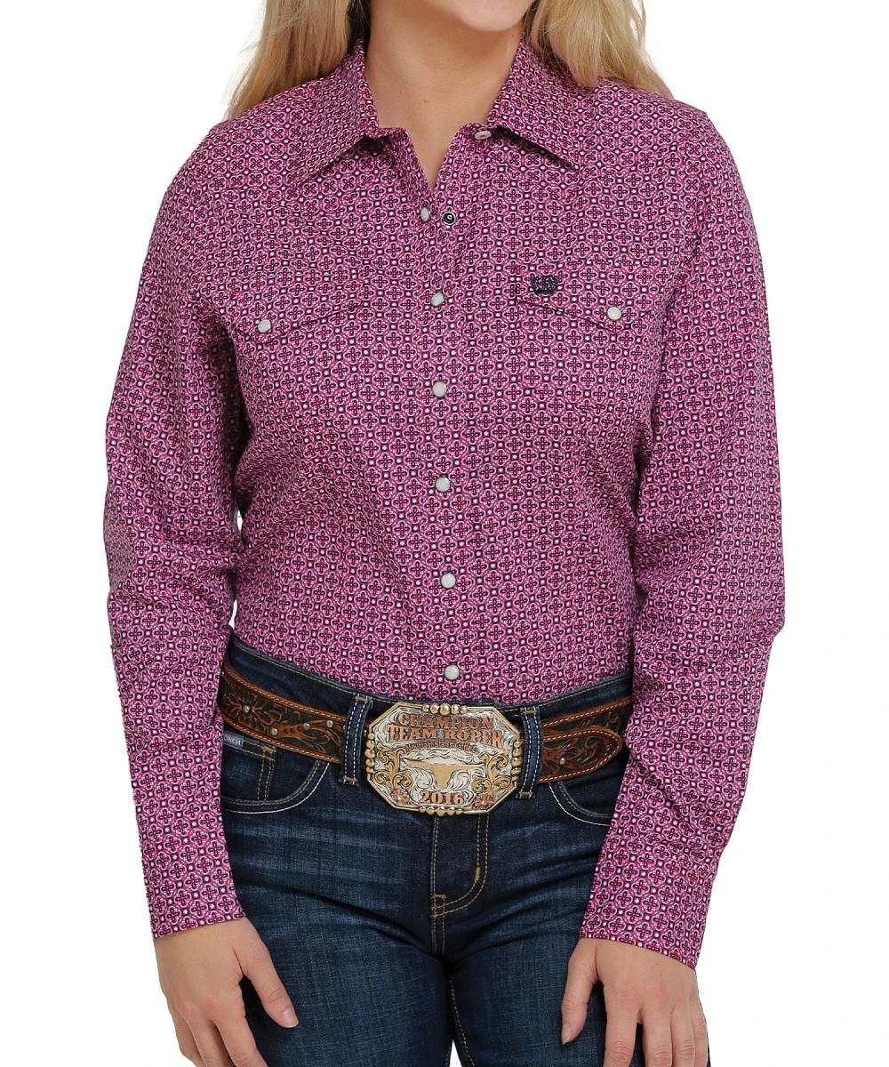 100% Cotton; Long Sleeve; Spread Collar; Snap Cuffs; Two Snap Flap Pockets; Pearl Snaps; Color: Pink, Red And Navy Medallion Print; Style #MSW9201034