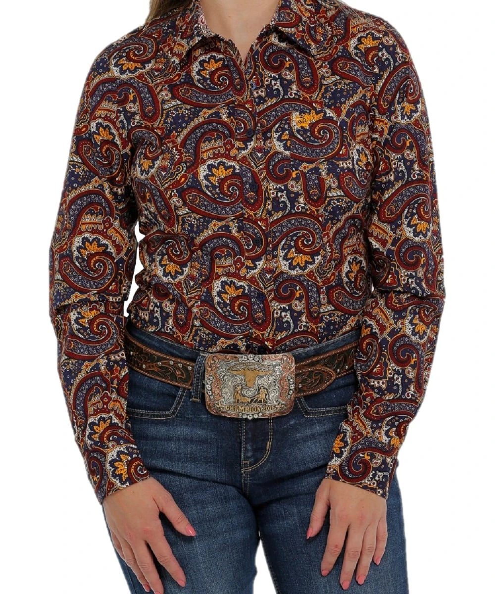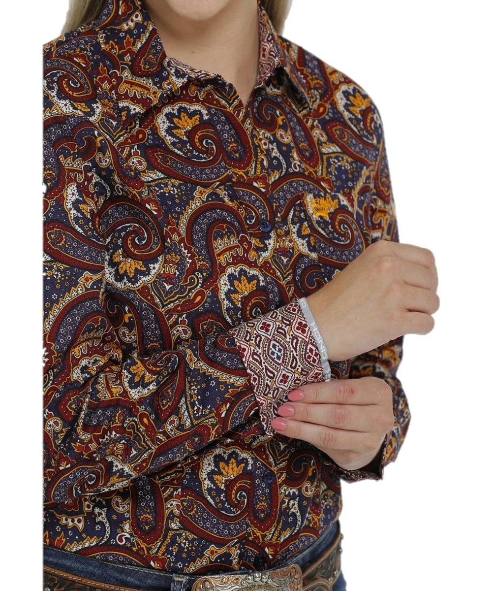 100% Cotton; Paisley Print; Fitted Fit; Dark Purple Buttons; Spread Collar; Long Sleeves; Button Down Closure; Open Left Front Pocket With Cinch Logo Embroidery; Contrast Trim On Collar And Cuffs; Colors: Navy/Burgundy/Mustard; Style #MSW9164189