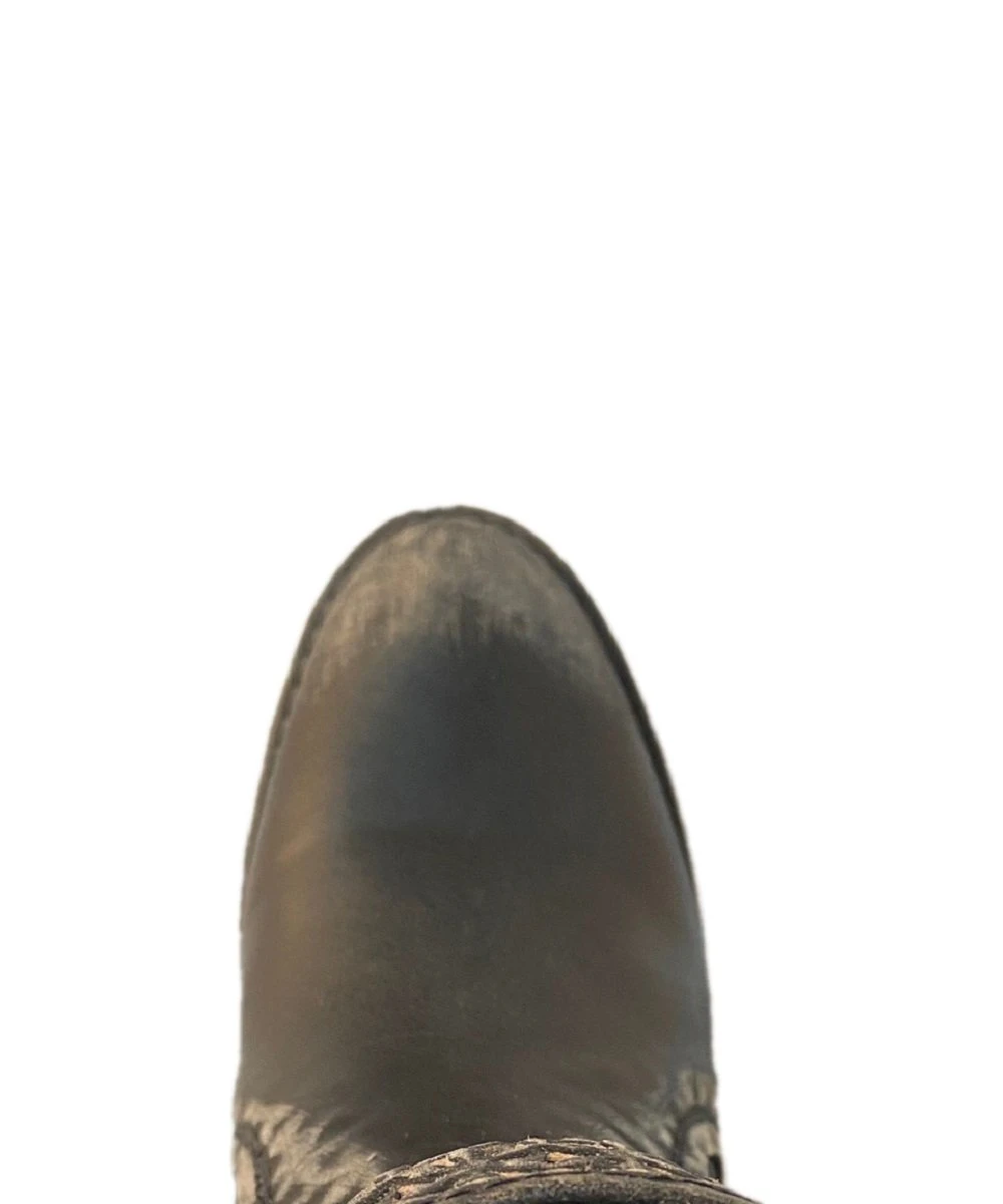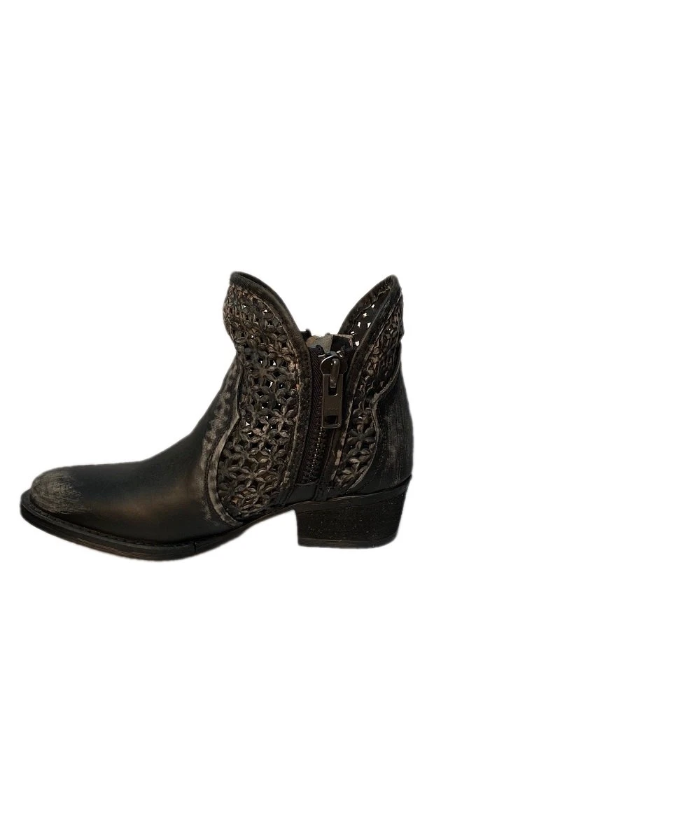 Distressed Black Leather; Leather Lining; Size Zipper For Easy On/Off; Intricate Laser Cutout Design; round Toe; 1 3/8″ Heel; Leather Outsole; Style #Q0001