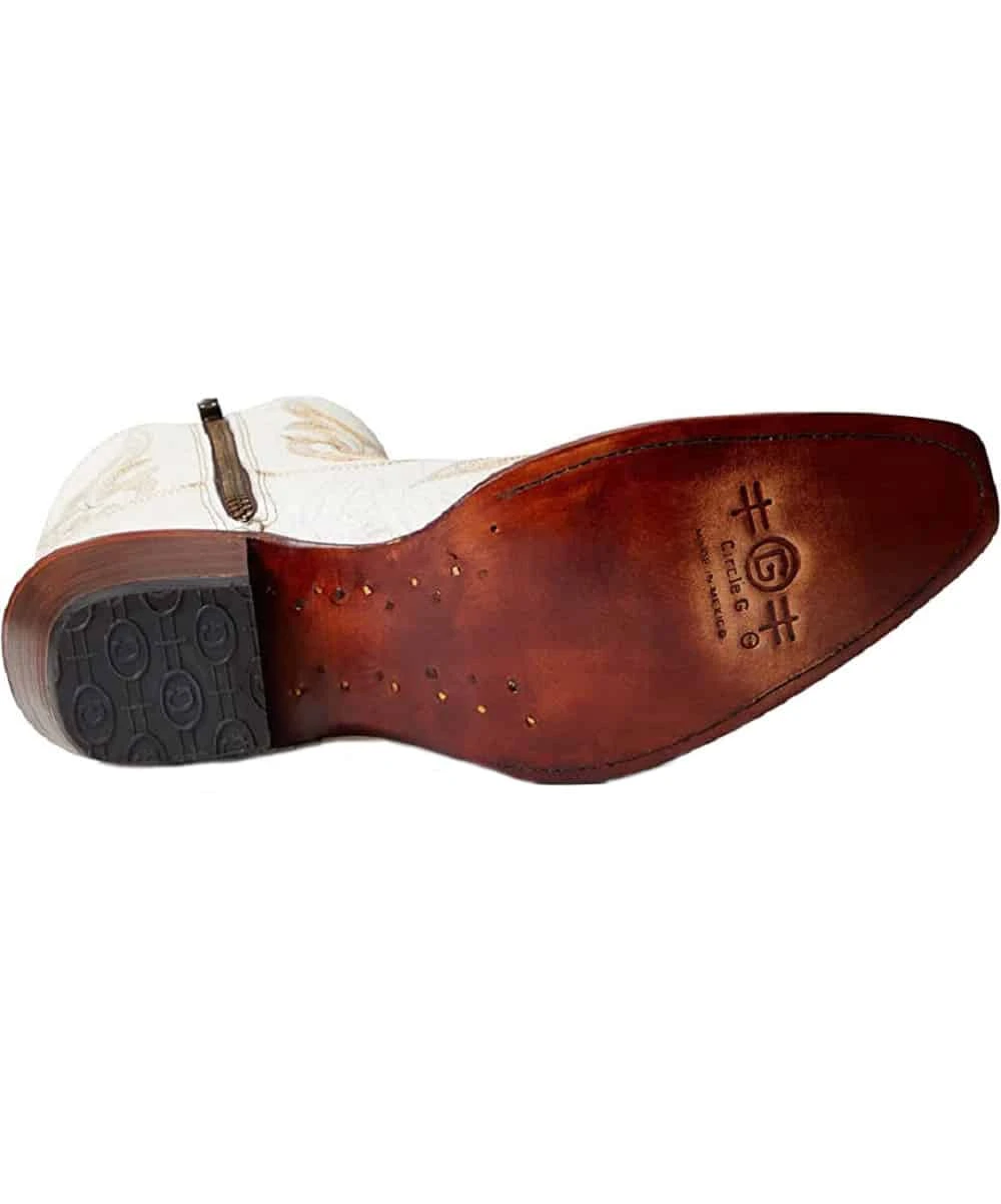 7″ Shaft Height; Leather Upper; Leather Lining And Insole; Side Zippered Closure; Pull Tab; Western Embroidery Detailing Allover; Leather Outsole; Goodyear Welt Construction; Cowboy Macocel Heel; 2″ Heel Height; Snip Toe; Color: Pearl White; Style #L5916