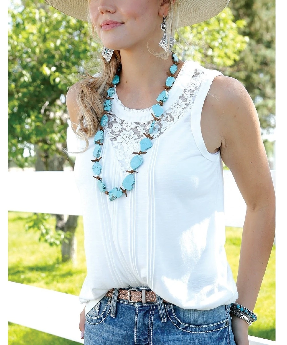 Cotton-Polyester Blend; Sleeveless Tank; Lace Yoke Detailing; Keyhole Back; Front Pleating; Color: White; Style #CTK7393001