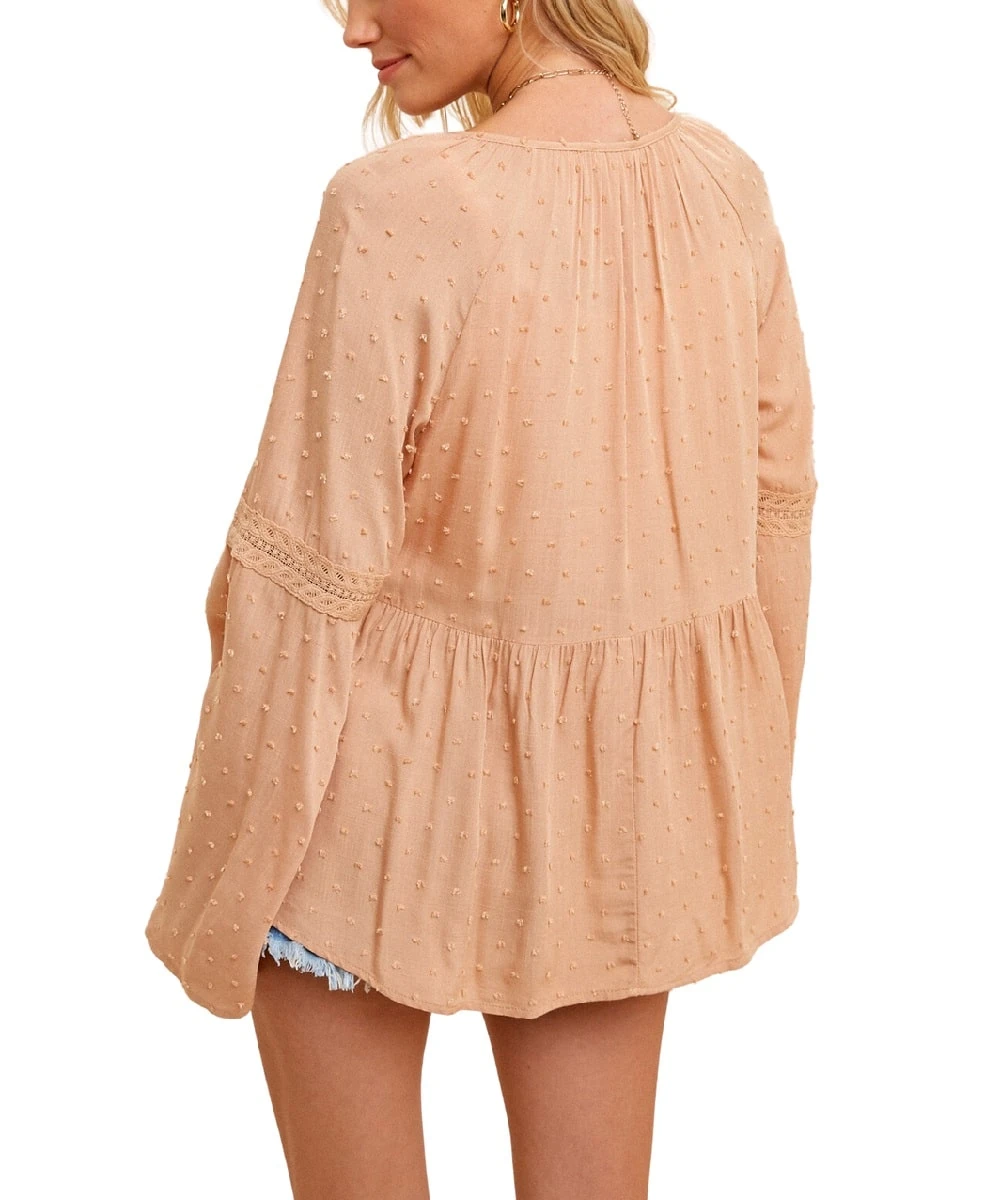 100% Rayon; Fits True To Size; Long Sleeve; Front Tie; Empire Waist; Lace Accent Placket; Swiss Dot Design; Lace Sleeve Accent; Bell Sleeves; Hi-Low Hem; Color:Â Peach; Style #39001E
