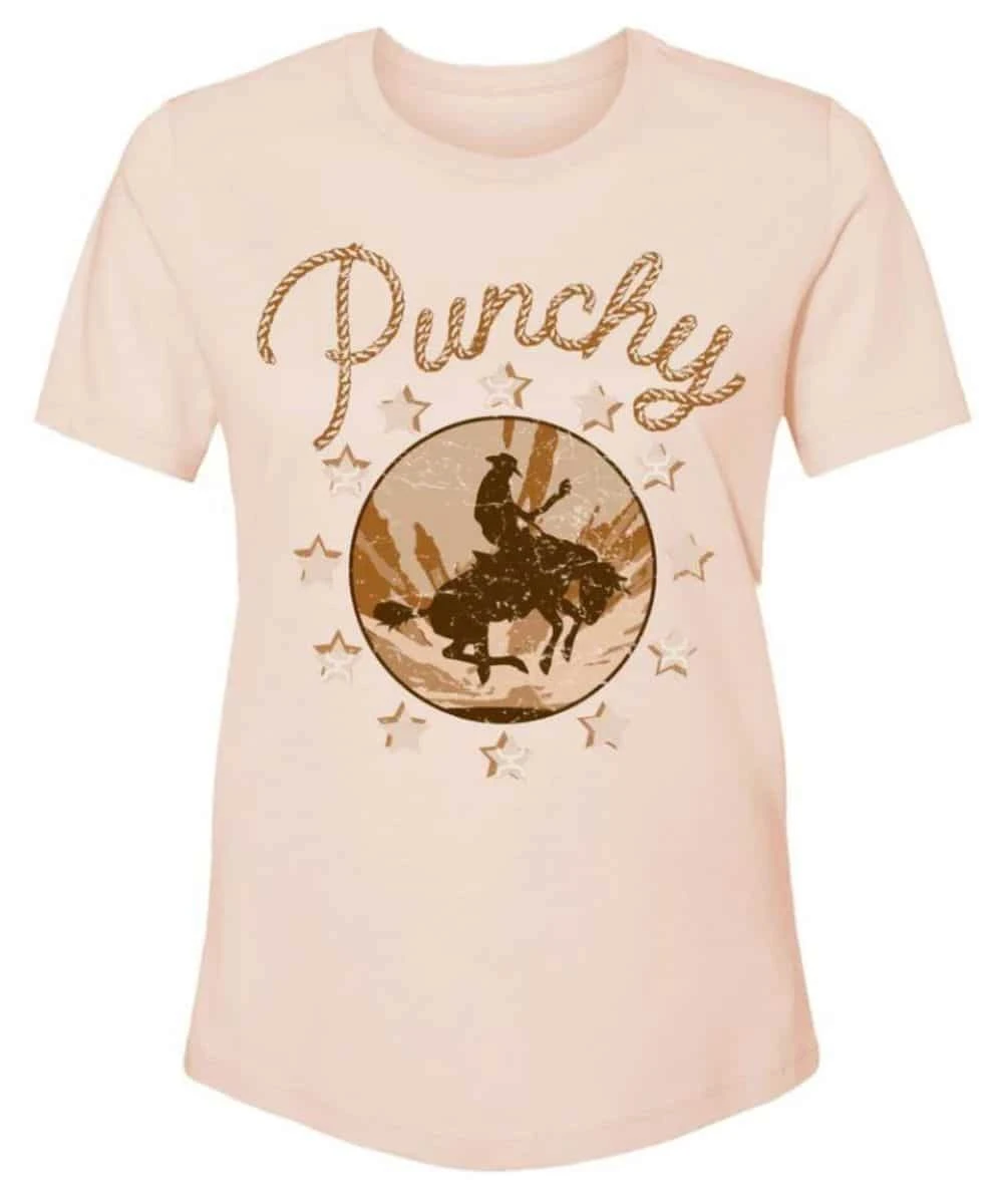 50% Cotton/ 50% Polyester; Color: Peach; Design Says “Punchy” With A Cowboy And Bronco; Short Sleeves; Traditional Fit; Style #HT1640LTPK