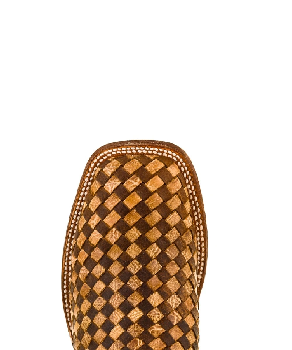 13″ Boot; Leather; Unbeweavable Crazy Train Leather Foot; Honey Crazyhorse Shaft; Multi Row Turquoise Shaft Stitching; Turquoise Accent Piping; Square Toe; Roper Heel; Leather Outsole; Style #M9092