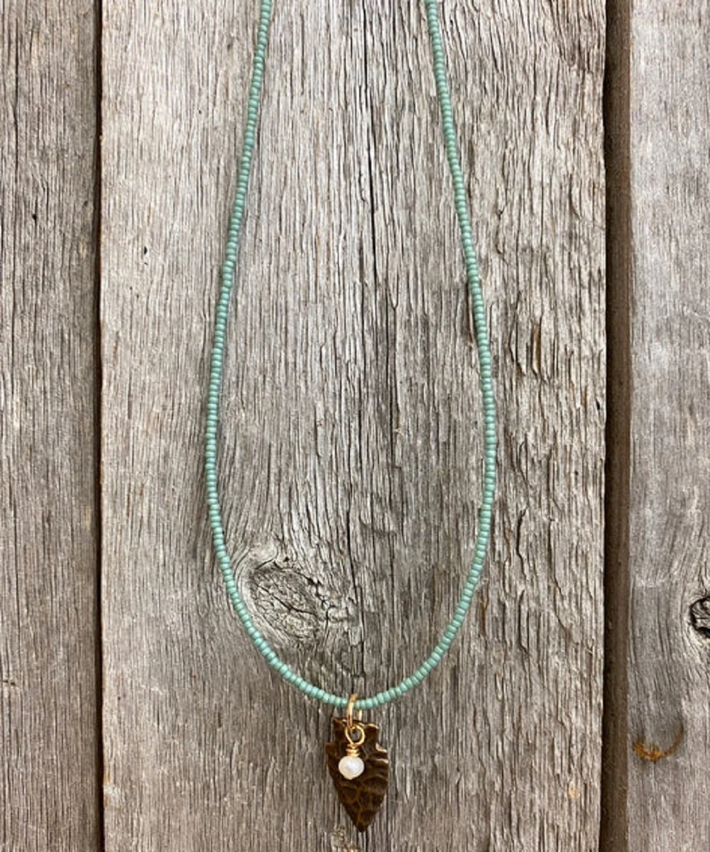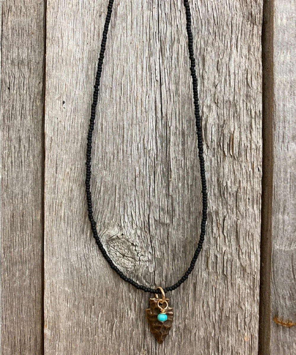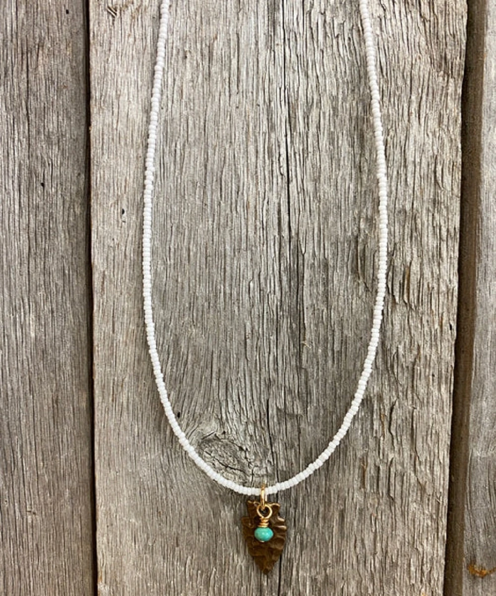 16″ Tiny Seed Beads; Bronze Hammered Arrowhead; Stone Drop; Bronze Lobster Claw Clasp; Color Options: Black, White And Turquoise; Style #17082