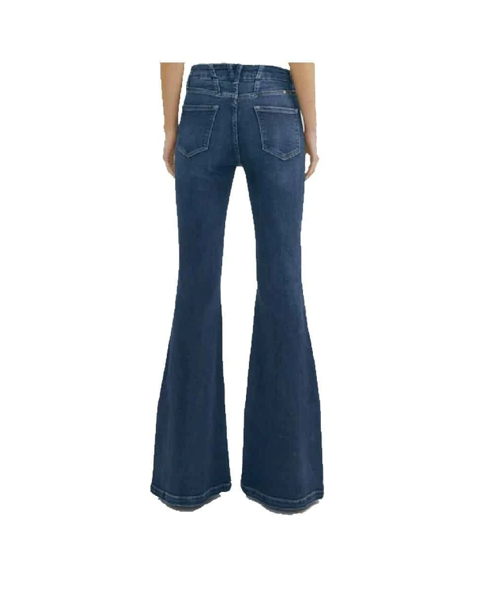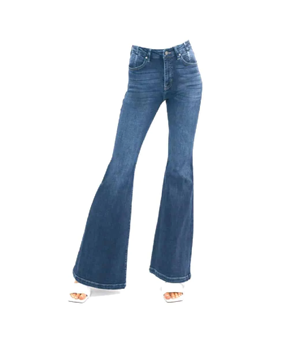 93% Cotton/5% T-400/2% Spandex; High Rise; Stretch; Button Closure; Zip Fly; Medium Fading; Whiskering; Darts Above Back And Front Pockets; Four Pocket Style; Super Flare Leg; Style #KC9306AD