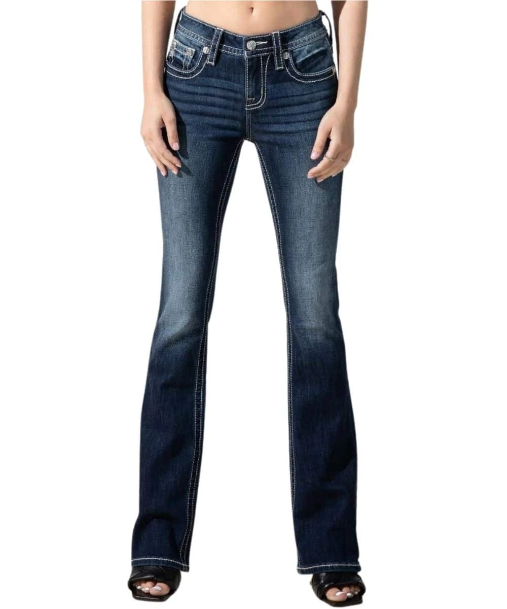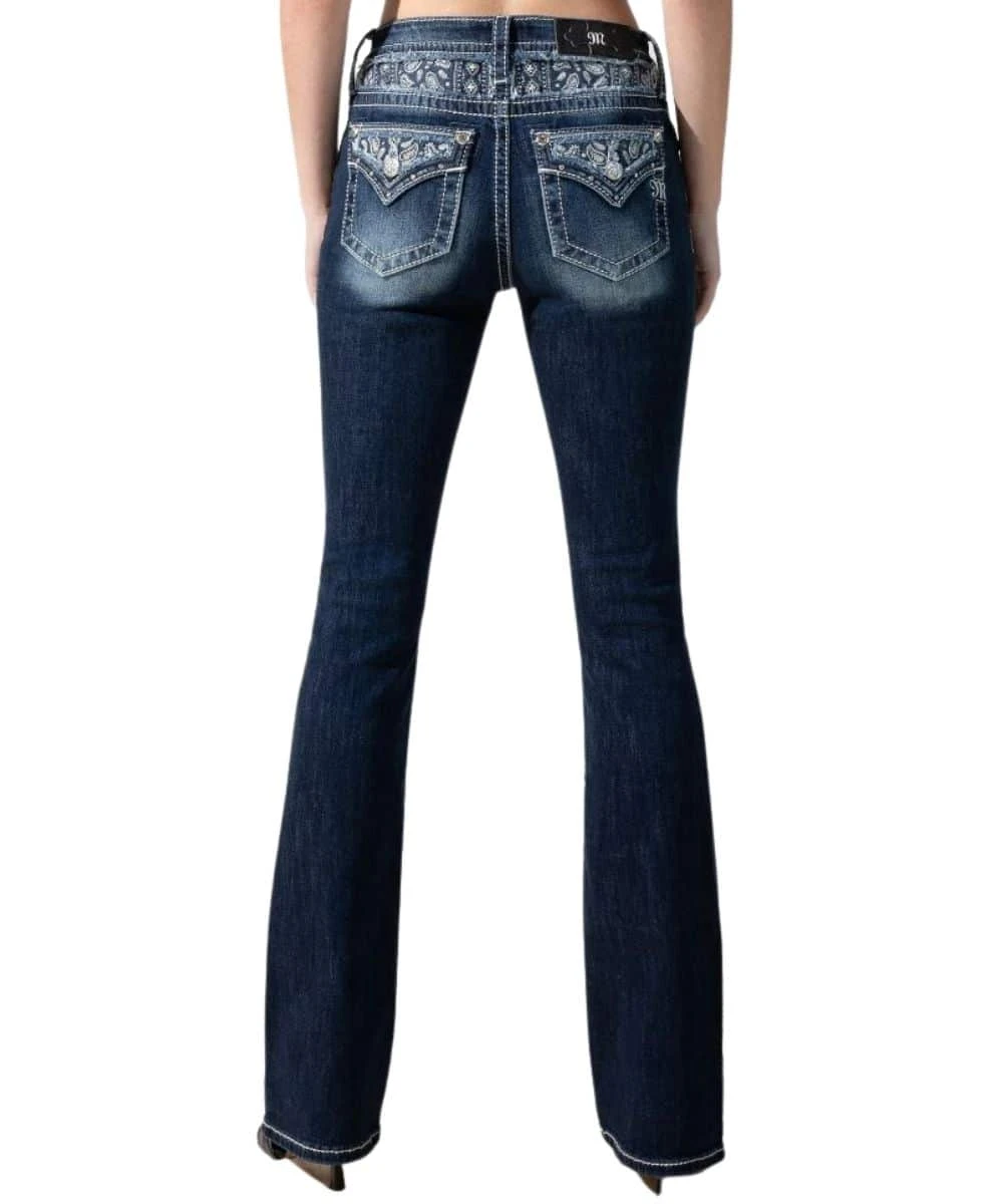 99% Cotton/ 1% Elastane; Color: Dark Blue Wash; Mid-Rise; Bootcut; Contrast Stitching; Paisley Print With Raw Hem Under Back Waist Line And Faux Pocket Flaps; Rhinestone Rivets; 34″ Inseam; Style #M3911B