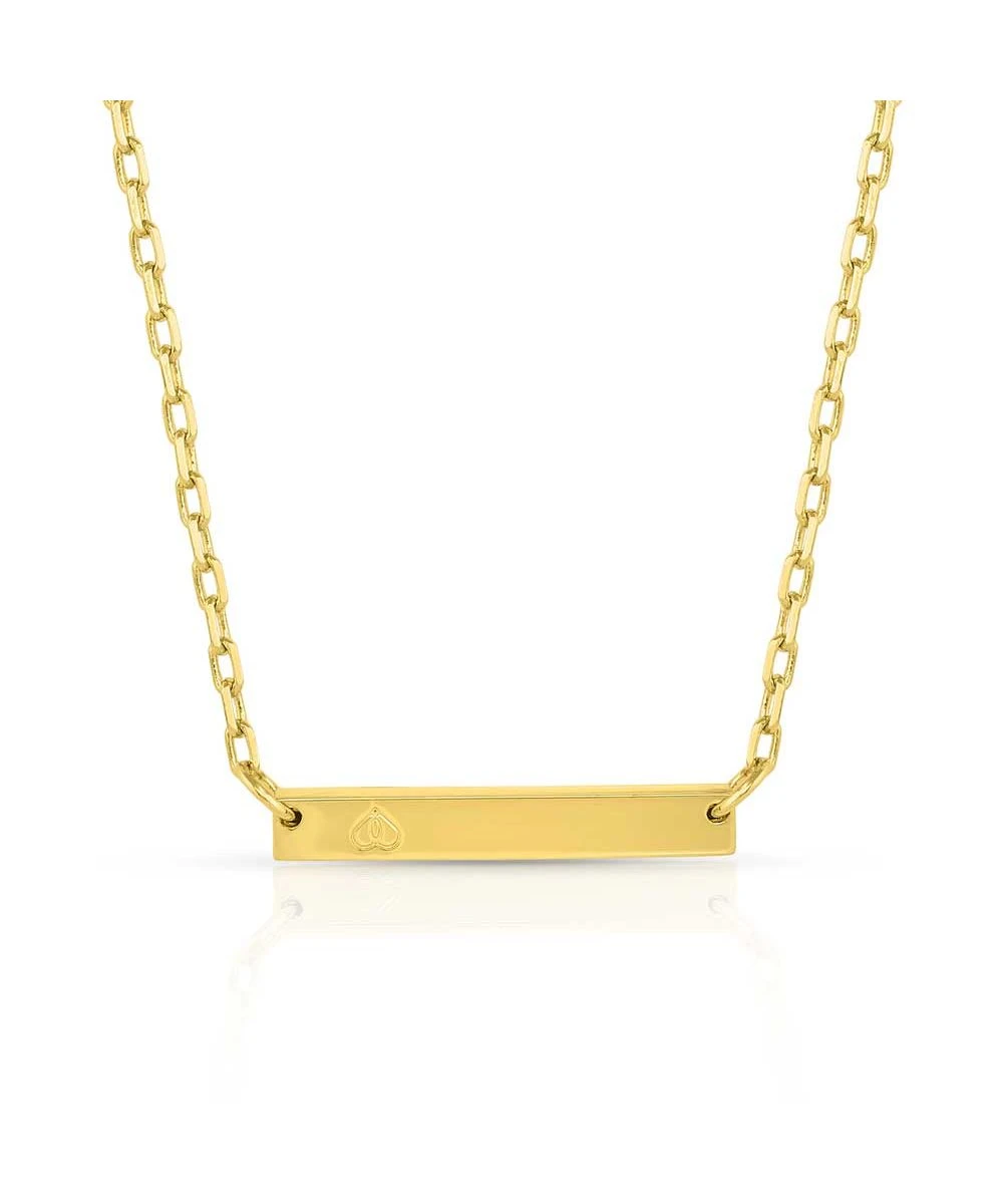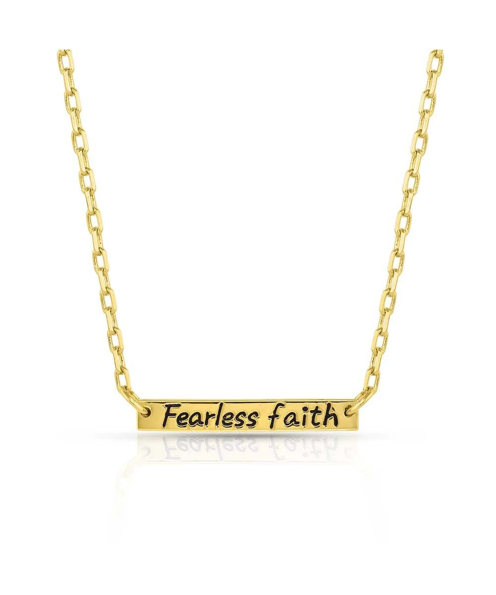 Yellow Gold Over Brass Base; Straight Rectangular Simplistic Bar Necklace; “Fearless Faith” Etched In Black Paint; 18″ Split Chain; Style #FFNC5061