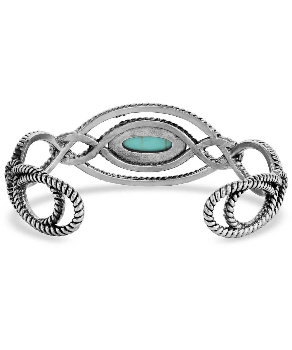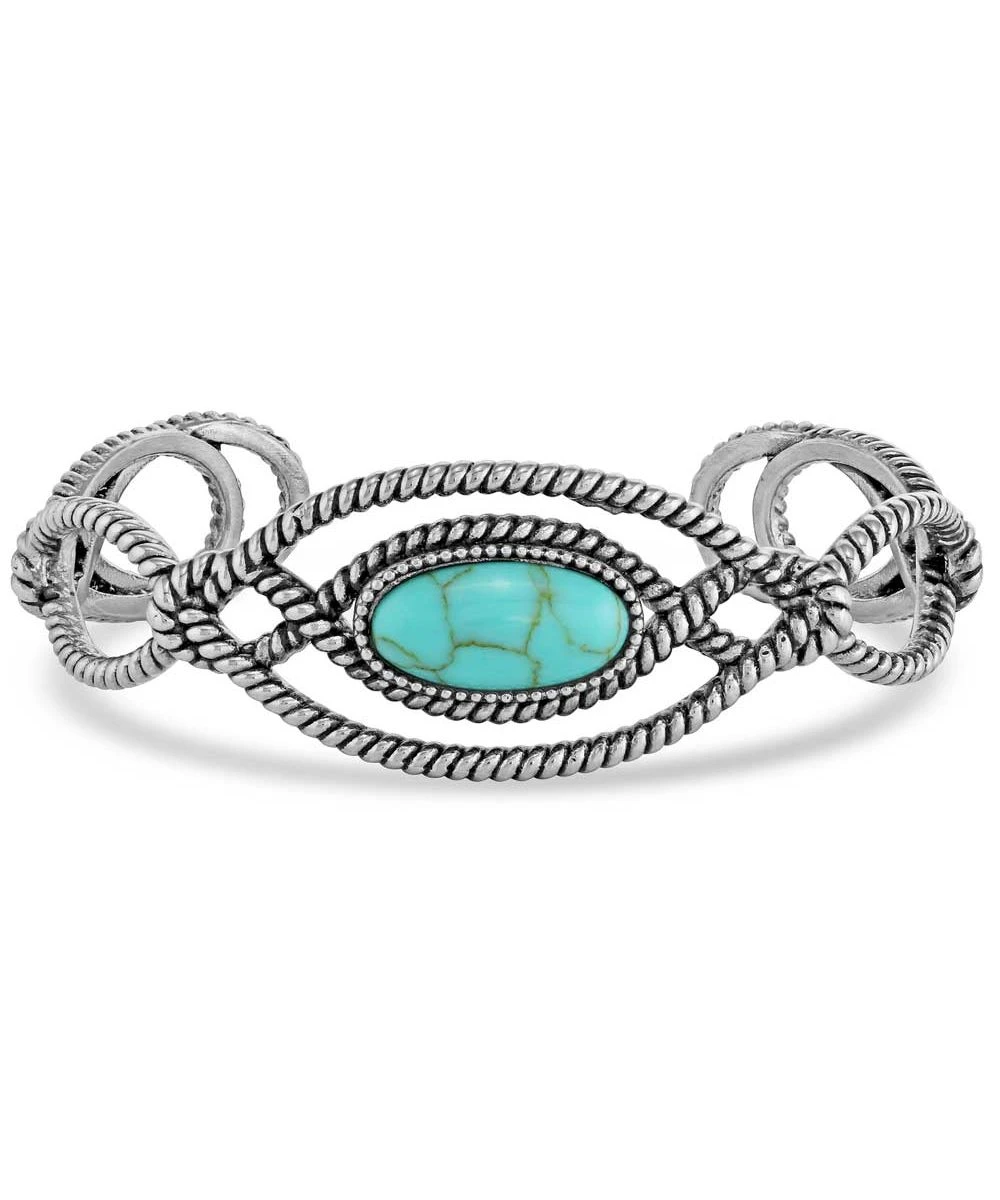 Silver Over Brass; Oval Synthetic Turquoise Stone Centerpiece; Open Design Wrap Around Cuff Bracelet In Silver Tone Twisted Rope Design; One Size Fits Most; Style #BC5468