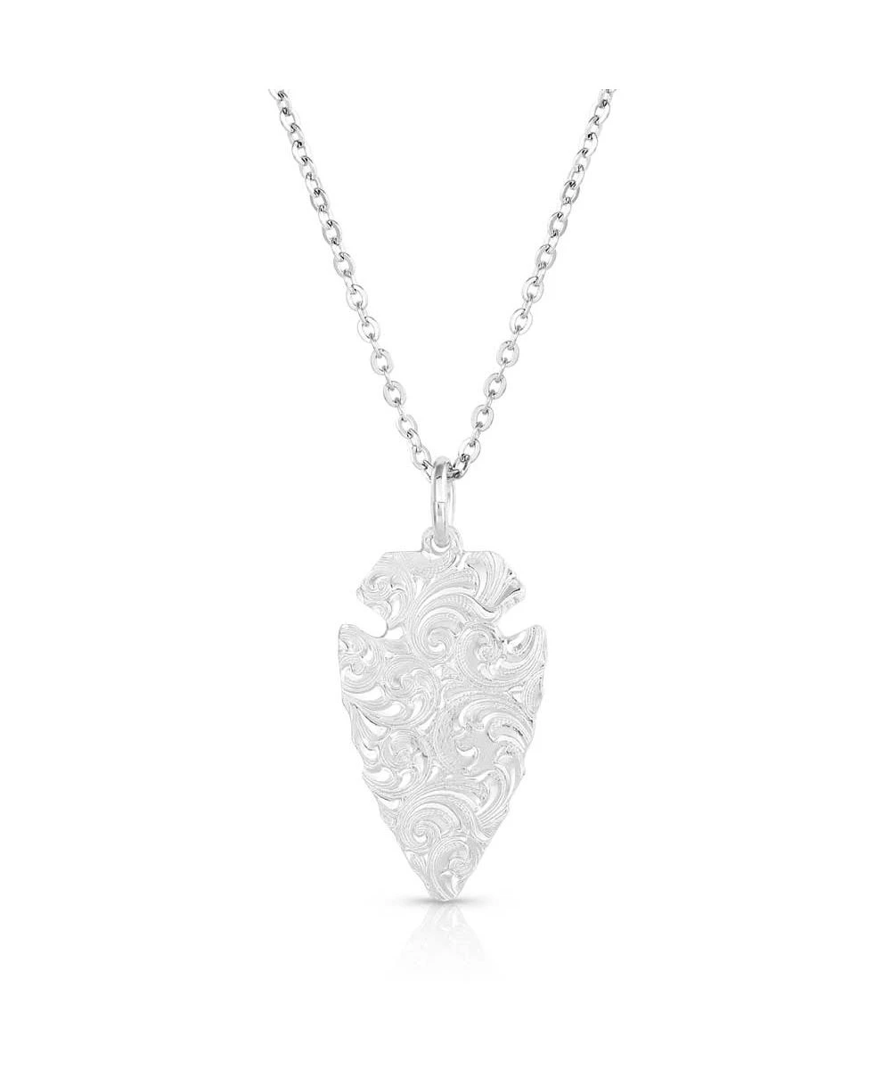99.99% Fine Silver Plated Over Brass; Pendant Necklace Features Chiseled Arrowhead Reproduced In Bright Silver Tone; Center Stone Of Compressed Turquoise With Copper; Filigree Etching Accents Centerpiece; 19″ Silver Tone Chain; Montana Armor To Prevent Tarnish; Style #NC5393
