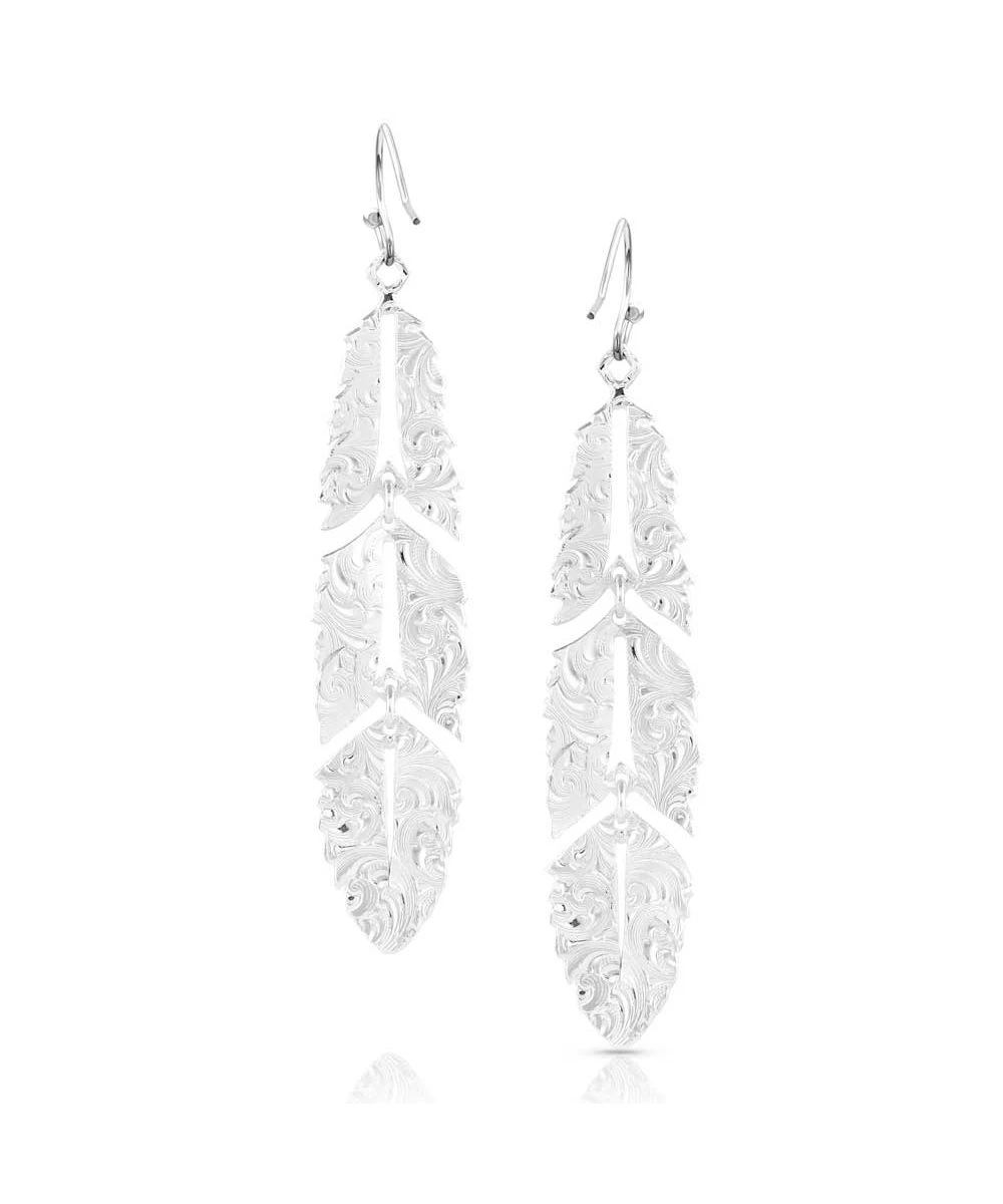 99.99% Fine Silver Over Brass Base; Feather Shaped Dangle Earrings; Feather Is Split Into Three Different Sections Offering Movement In The Design; Open Cut Vein Of Feather Provides Delicacy; Hypoallergenic Stainless Steel French Hooks; Montana Armor To Prevent Tarnish; Style #AMER5459
