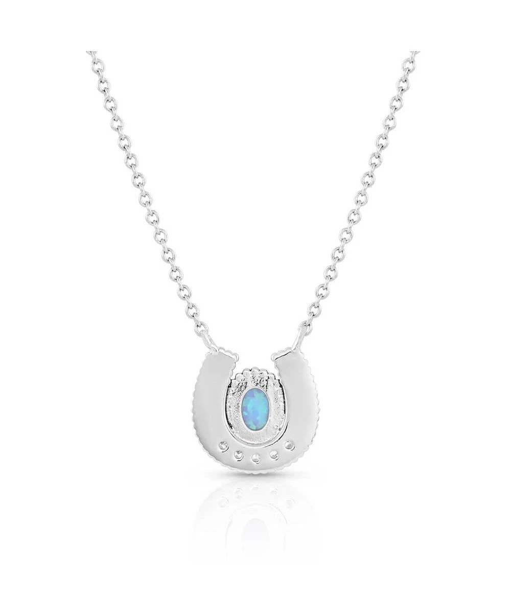 Rhodium Over Brass Base; Horseshoe Shaped Pendant Necklace With Filigree Etchings And Cubic Zirconia Stones; Center Oval Synthetic Opal Stone; 19″ Chain; Style #NC5121