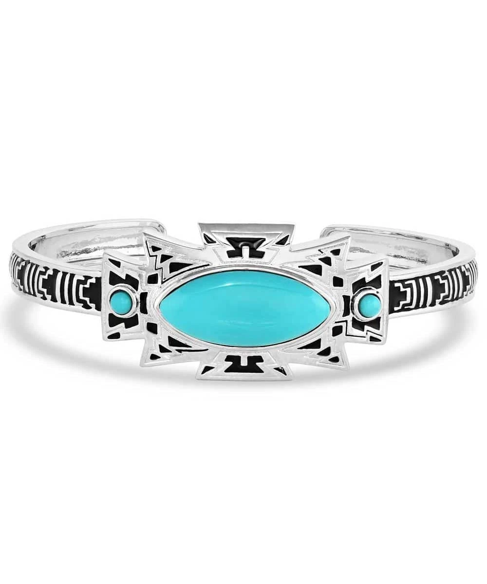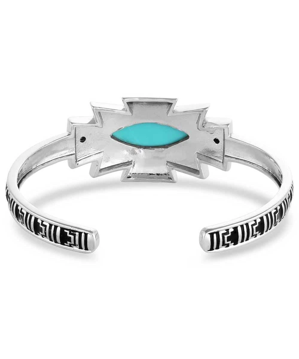 Silver Over Brass; Open Cuff Bracelet; Designed In Gleaming Silver Finish With An Oval Synthetic Turquoise Centerpiece; Black Paint Geometric Accent Designs; 6″ Length; Style #BC5353