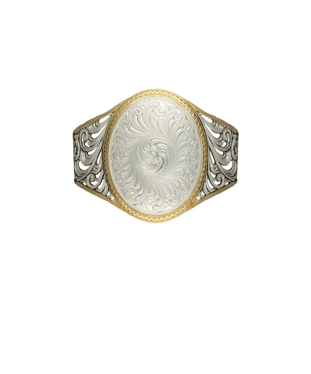 Reminiscent Of Vintage Cameo Portraits; Brightly Polished Silver Plate Engraved In Traditional Western Bright Cut Style; Framed On Each Side With Open Filigree Of Flowers And Vines Wrapping Around The Wrist; Sterling Silver And 22 Carat Gold Plate Over Solid Brass Base; Measures Approximately: 2″ W X .08″ H X 6″ L; Style #BC2031