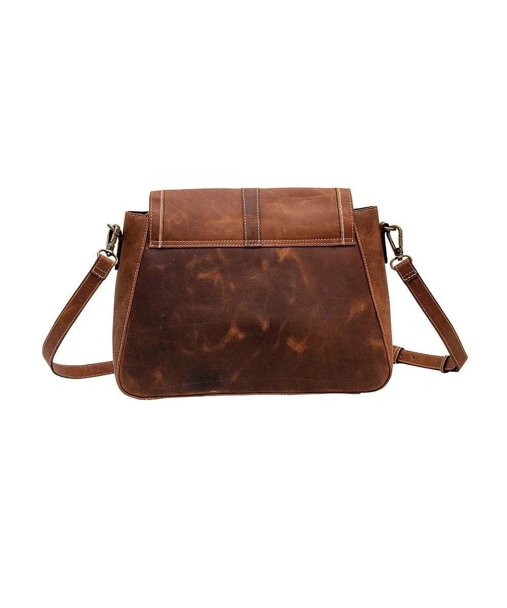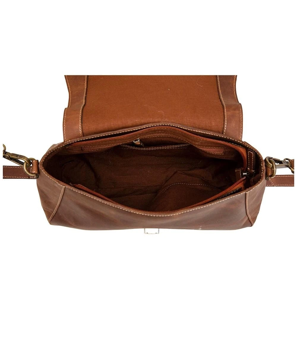 Leather; Two-Toned Brown Distressed Leather; Flap Closure; Interior Zip Pocket; 22″ Shoulder Strap; Measures Approximately: 11″W x 5″D x 8″H; Style #S-6524