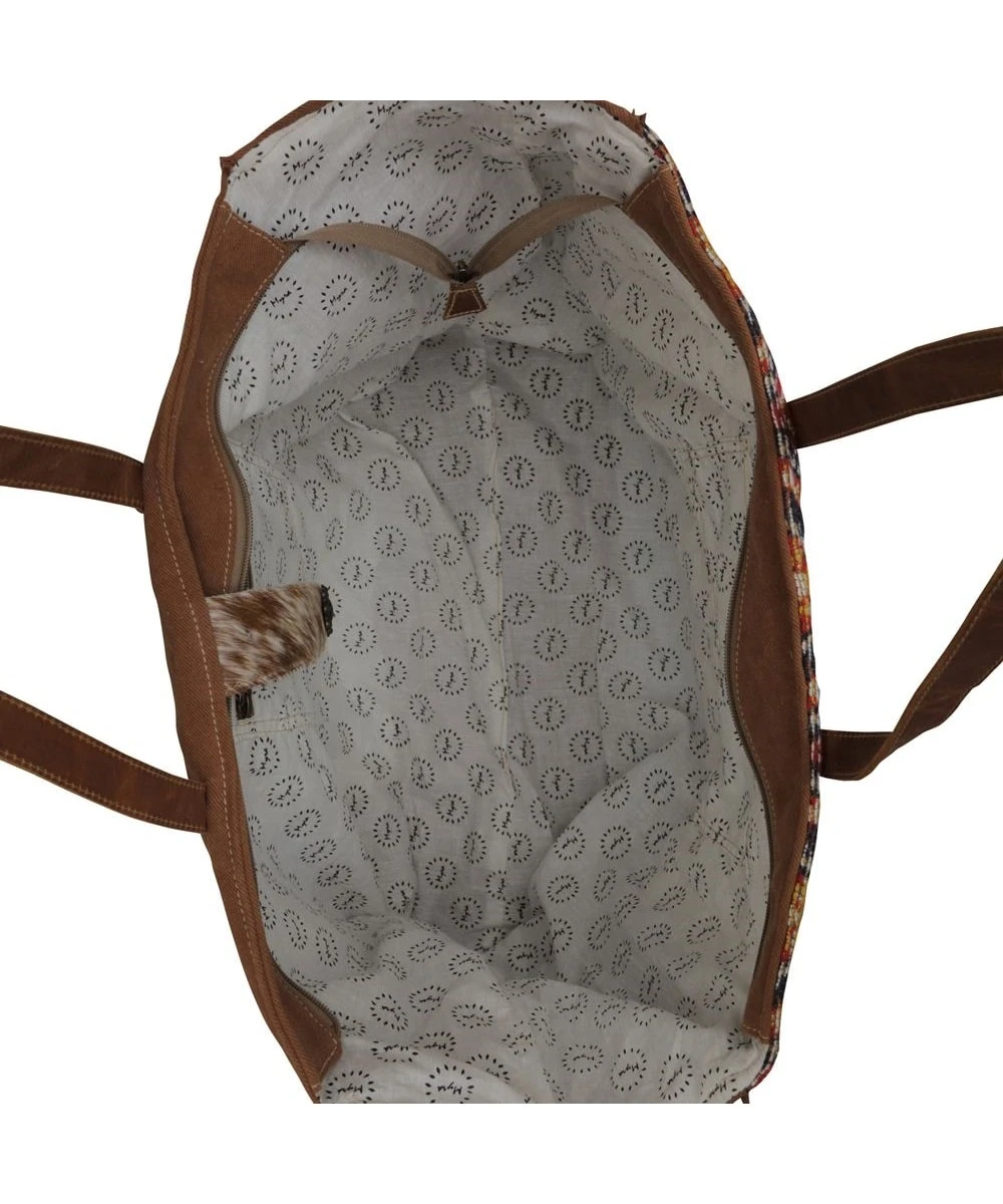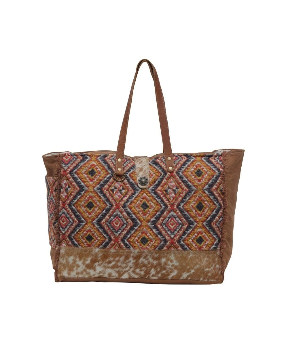 Canvas And Leather; Geometric Pattern On Canvas; Hair On Leather Strap Along Bottom; Hair On Leather Snap Closure; Raw Edges; 1 Exterior Zip Pocket; 1 Interior Zip Pocket; 11.5″ Handle; Measures Approximately: 20″W x 9″D x 16″H; Style #S-5636