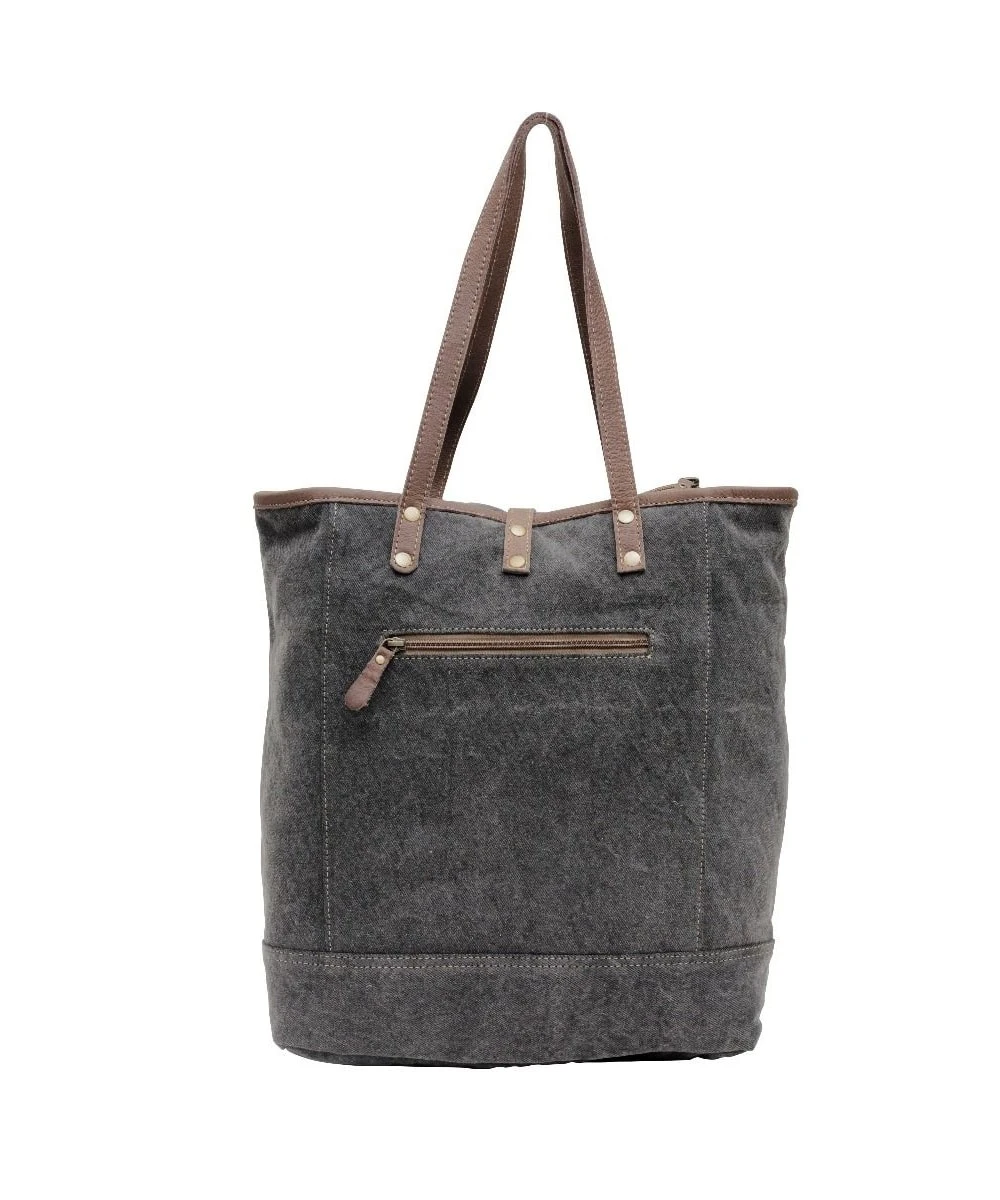 Canvas And Leather; Buckle Detail On Top; Zip Top Closure; 1 Interior Zip Pocket; 1 Interior Pouch; 11″ Handle; Measures Approximately: 17.5″W x 4.5″D x 16″H; Style #S-6161
