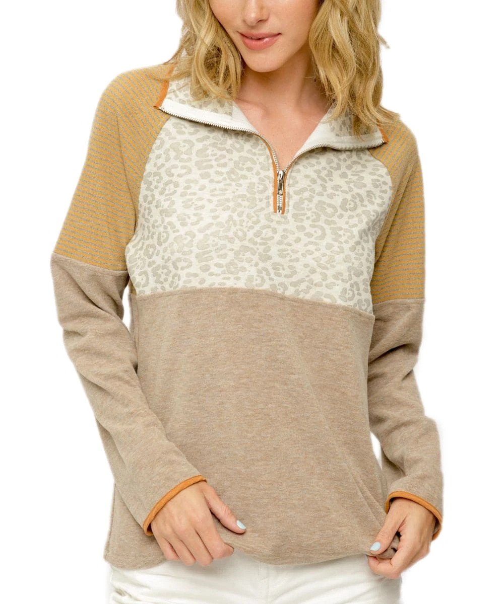 Self: 72% Polyester/22% Rayon/6% Spandex; Contrast: 70% Polyester/20% Cationic Cotton/10% Spandex; Contrast 2: 65% Polyester/30% Rayon/5% Spandex; Quarter Zip Collar; Contrast Sleeves; Color Block Design; Style #19550