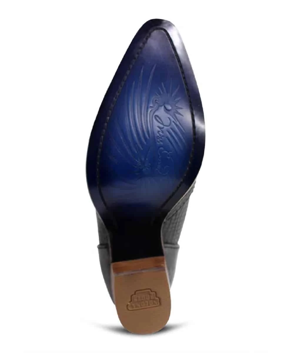 Black Rattle Snake Print Cowhide Vamp; 2 1/2″ High Heel; Brown Heel; Cushioned Insole; Pig Lining; Single Stitched Welt; Snip Toe; Rubber Outsole; Style #ME1920