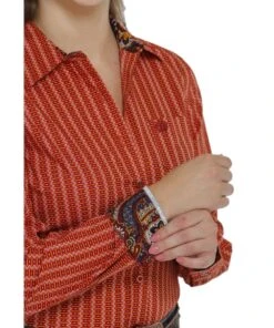 100% Cotton; Long Sleeve; Spread Collar; Black Snap Closures; Snap Front And Cuffs; Snap Flap Chest Pockets; Single Point Front Yoke; Red, Orange, Black And White Geometric Print; Color: Burgundy; Style #RRWSOSRZ1K