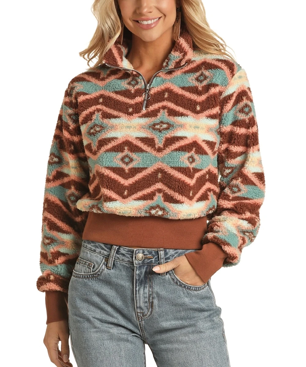 100% Polyester; 1/4 Zip; Rib Knit Cuffs And Waistband; Turquoise, Coral, Cream And Brown Geometric Print; Color: Chocolate; Style #RRWT91R04K