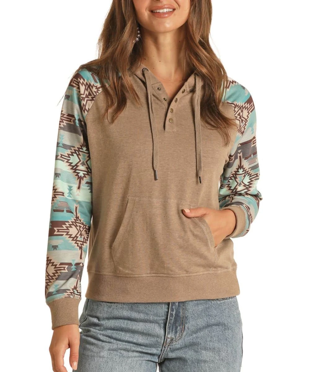 60% Cotton/40% Polyester; Long Sleeve; Drawstring Hooded Sweatshirt; 4 Snap Placket; Contrast Aztec Sleeves; Ribbed Sleeves, Cuffs, And Hood Trim; Kangaroo Pocket; Color: Turquoise/Brown; Style #RRWT94R0Y9
