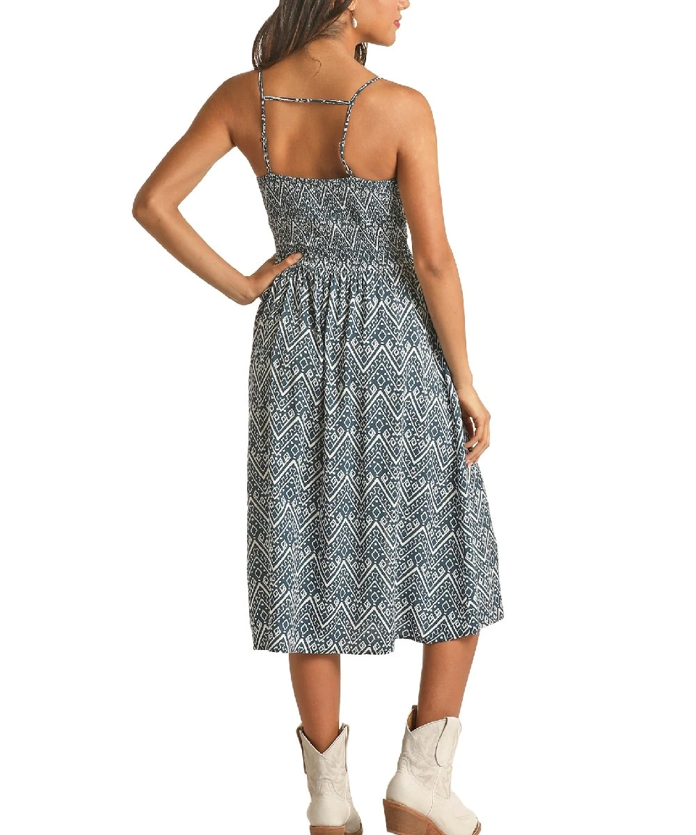 100% Rayon; V Neck; Button Front Closure; Midi Length; Smocked Back; Adjustable Spaghetti Straps; Color: Navy And White Southwestern Design Print; Style #RRWRD0RZMV