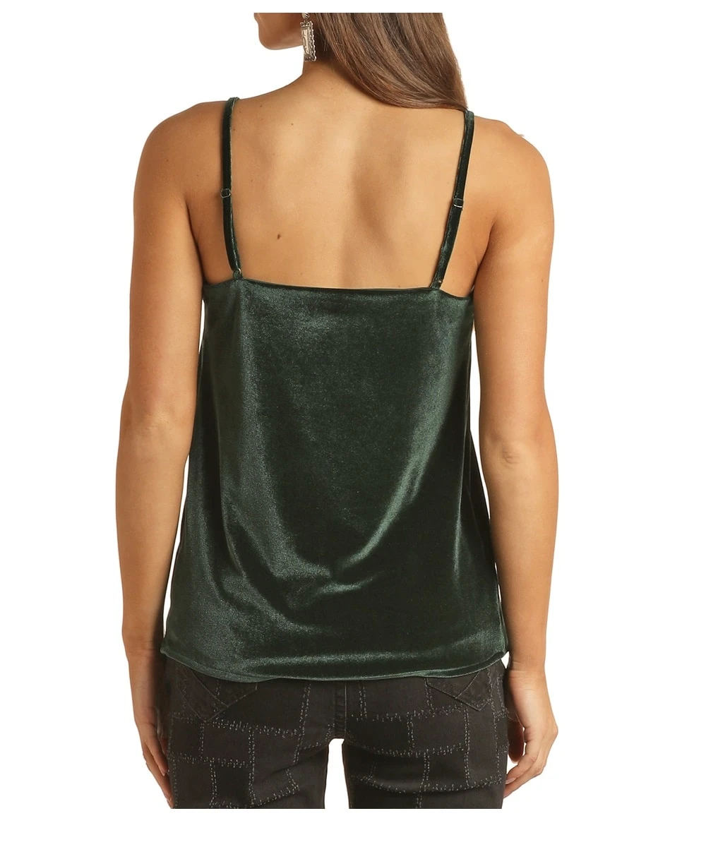 95% Polyester/5% Spandex; Crushed Velvet Cami; Leopard Print Mesh Detail Across Top Front; Adjustable Shoulder Straps; Color: Emerald Green; Style #RRWT20R0D2