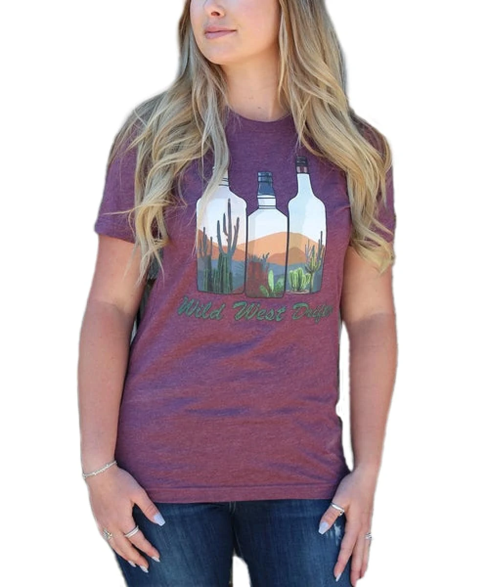 52% Cotton/48% Polyester; Unisex Fit; Fits True To Size; Crew Neck; Color: Heather Purple; Front Desert Whiskey Bottle Print Reads: Wild West Drifter; Style #WILD WEST DRIFTER TEE