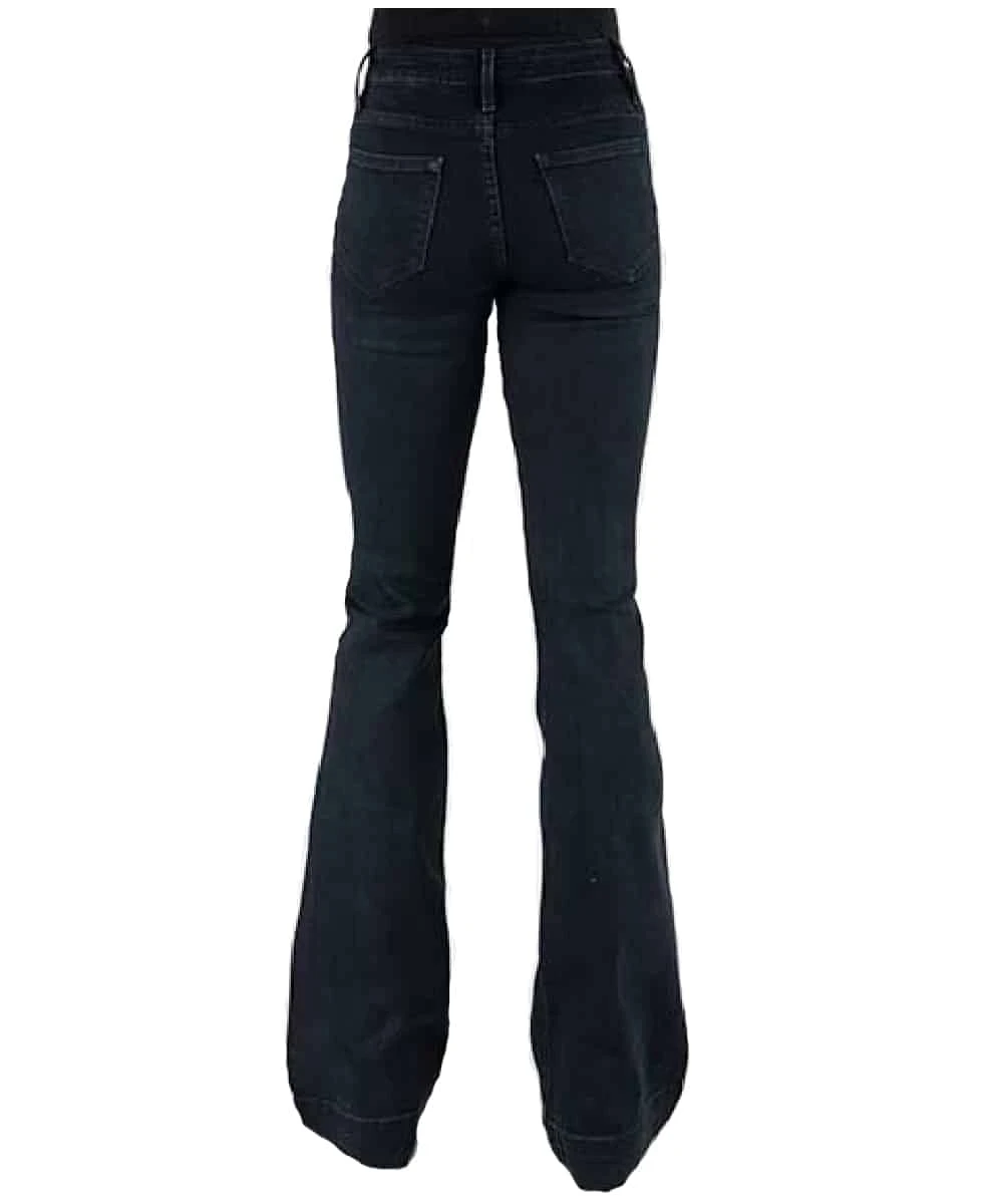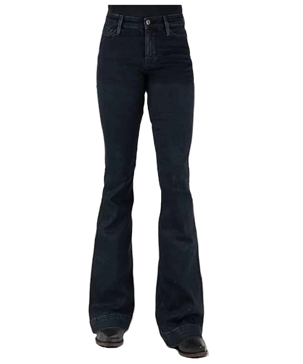 98% Cotton/2% Spandex; Color: Black; High Waist; Stetson Branded Buttons, Rivets, And Zipper; Five Pocket Design; Plain Back Pockets; Slim Fit Through Thigh And Knee With Flare Leg Opening; Slight Sanding Details; Stylish Wide Pant Leg Hem; Style #11-054-0921-2414