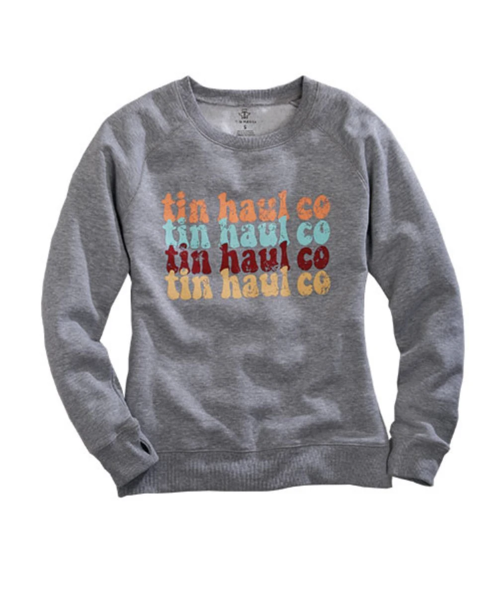 52% Cotton/48% Polyester; Fleece Knit; Crew Neck Sweatshirt; Long Sleeve; Raglan Sleeves; Rib Knit Waistband, Neckline, And Cuffs; Tin Haul Co Screen Print; Color: Heather Grey; Style #10-098-0300-0753