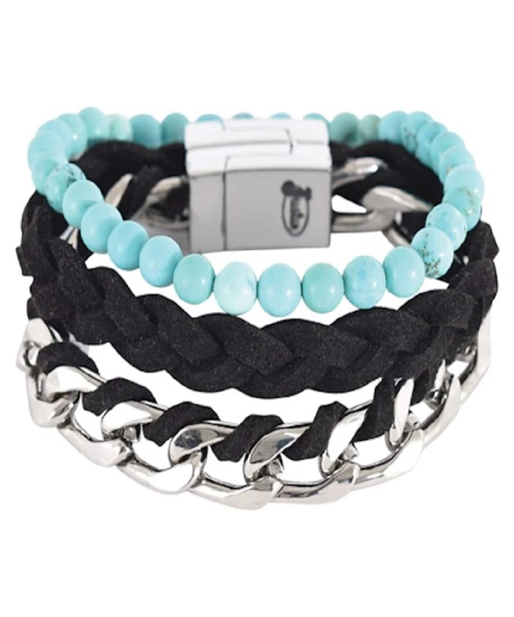 3-Piece Bracelet Set: Chain Bracelet Made With Zinc Alloy With Rhodium Plating/ Braided Bracelet Made With Genuine Suede/ Beaded Bracelet Made With Faux Turquoise Beads; Turquoise And Black Colors; Justin Bracelet Set; Style #22065BJ1