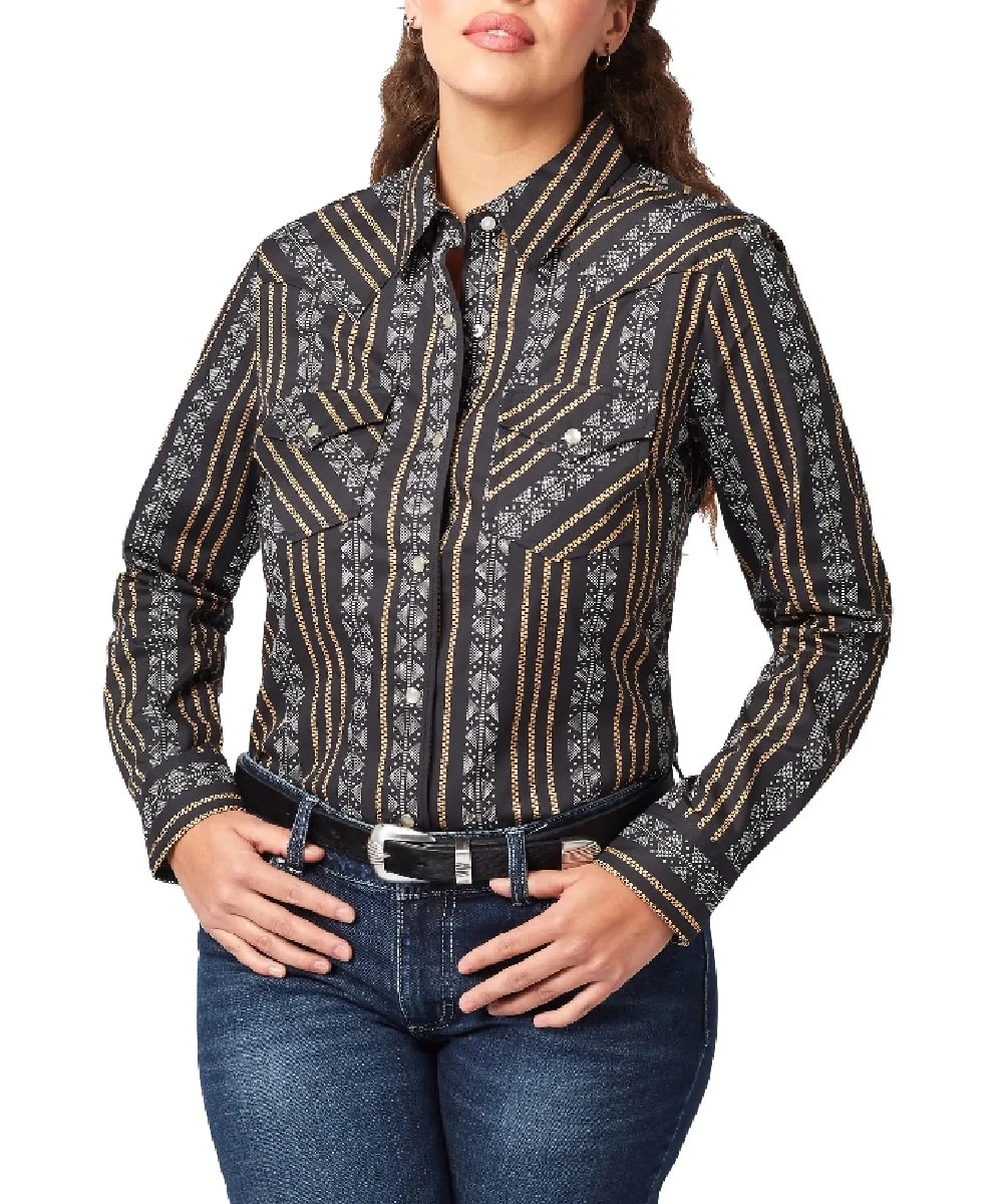 100% Cotton; Spread Collar; Long Sleeve; Snap Front Closure; Western Single Point Front Yokes; Two Single Point Snap Flap Chest Pockets; One Western Single Point Yoke On Back; Double Snap Cuffs; Color: Black With Yellow And White Geo Print; Style #112321392