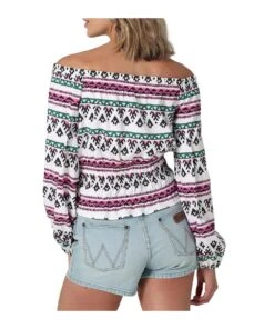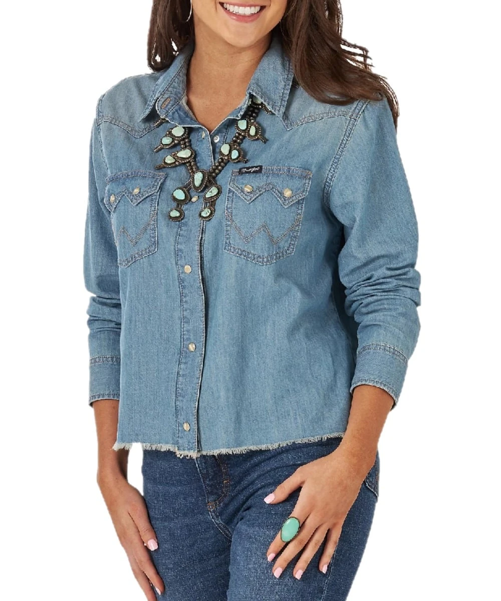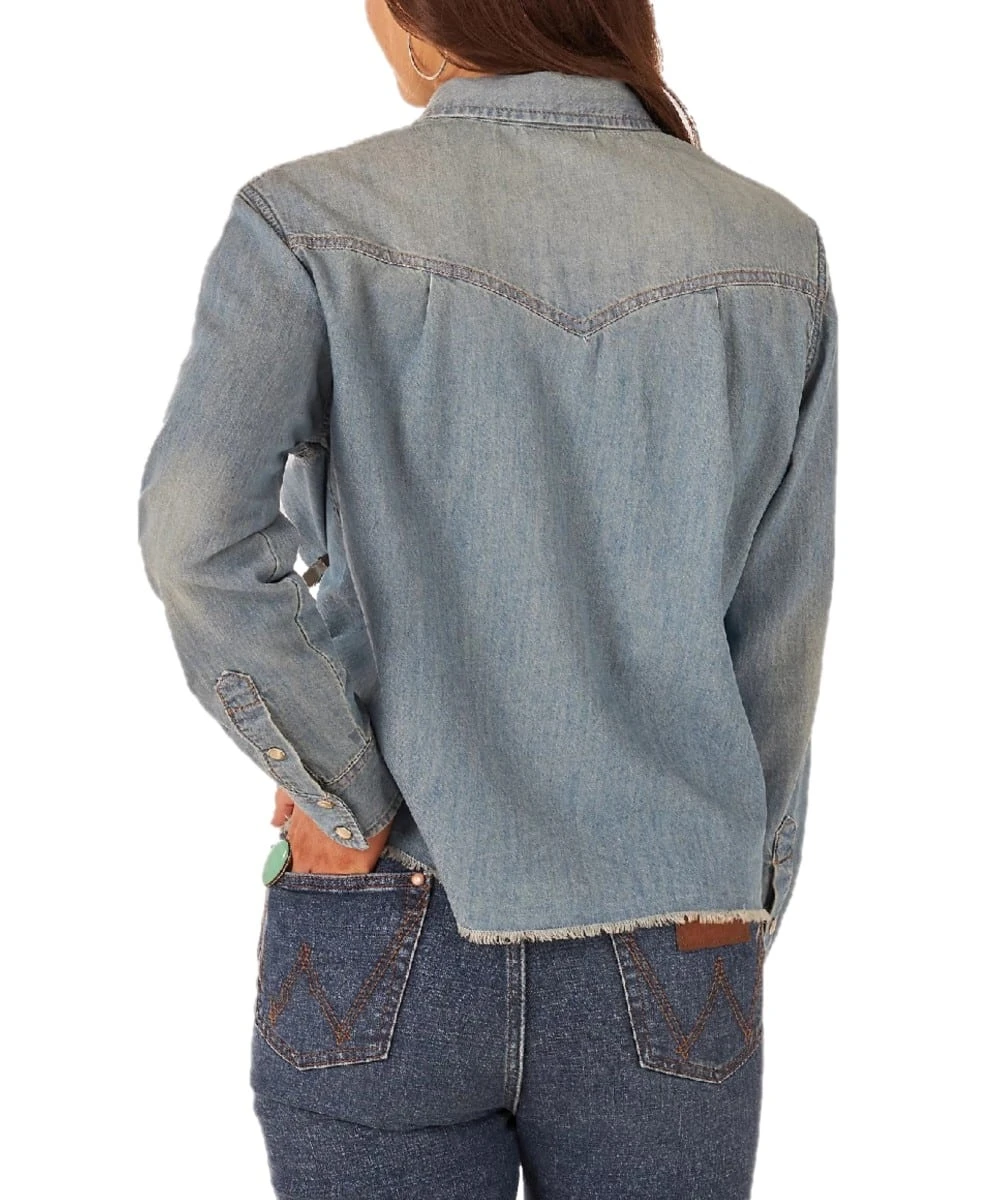 100% Cotton; 5.25 Oz. Denim; Boyfriend Fit; Spread Collar; Light Wash With Fading; Long Sleeve; Pearl Snap Closure; Double Sawtooth Chest Pockets With Flaps, Snaps, And W Embroidery; Two Single Point Yokes On Front; One Single Point Yoke On Back; Crop Length; Raw Hem; Three Snaps On Cuffs; Color: Denim; Style #112317328