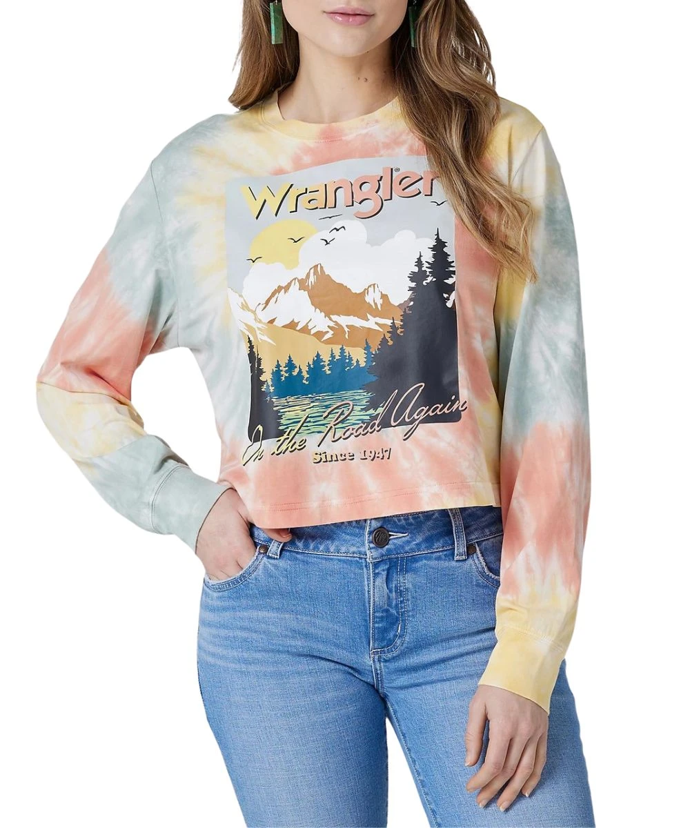 50% Cotton/50% Polyester; Relaxed Fit; Long Sleeve; Crew Neck; Front “On The Road Again” Graphic Print; Straight Bottom Hem; Cropped Tee; Ribbed Cuffs; Color: Pastel Tie-Dye; Style #112327239