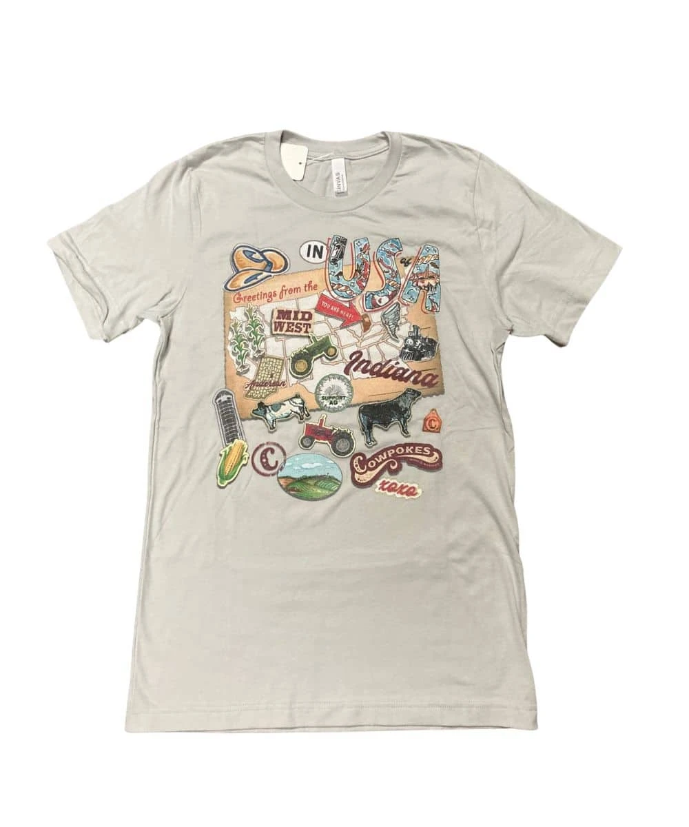 100% Cotton; Color: Gray; USA Design With Indiana Themed Graphics Including Corn, FFA, And Cowpokes; Short Sleeves; Crew Neck; Style #XOUSA
