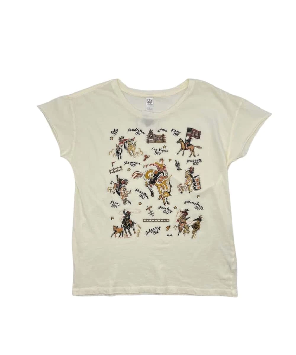 100% Cotton; Raw Edge Short Sleeves; Distressed Neck And Waist; Front Graphic Tee Rodeo Prints; Color: Cream; Style #GPA’S WALLPAPER